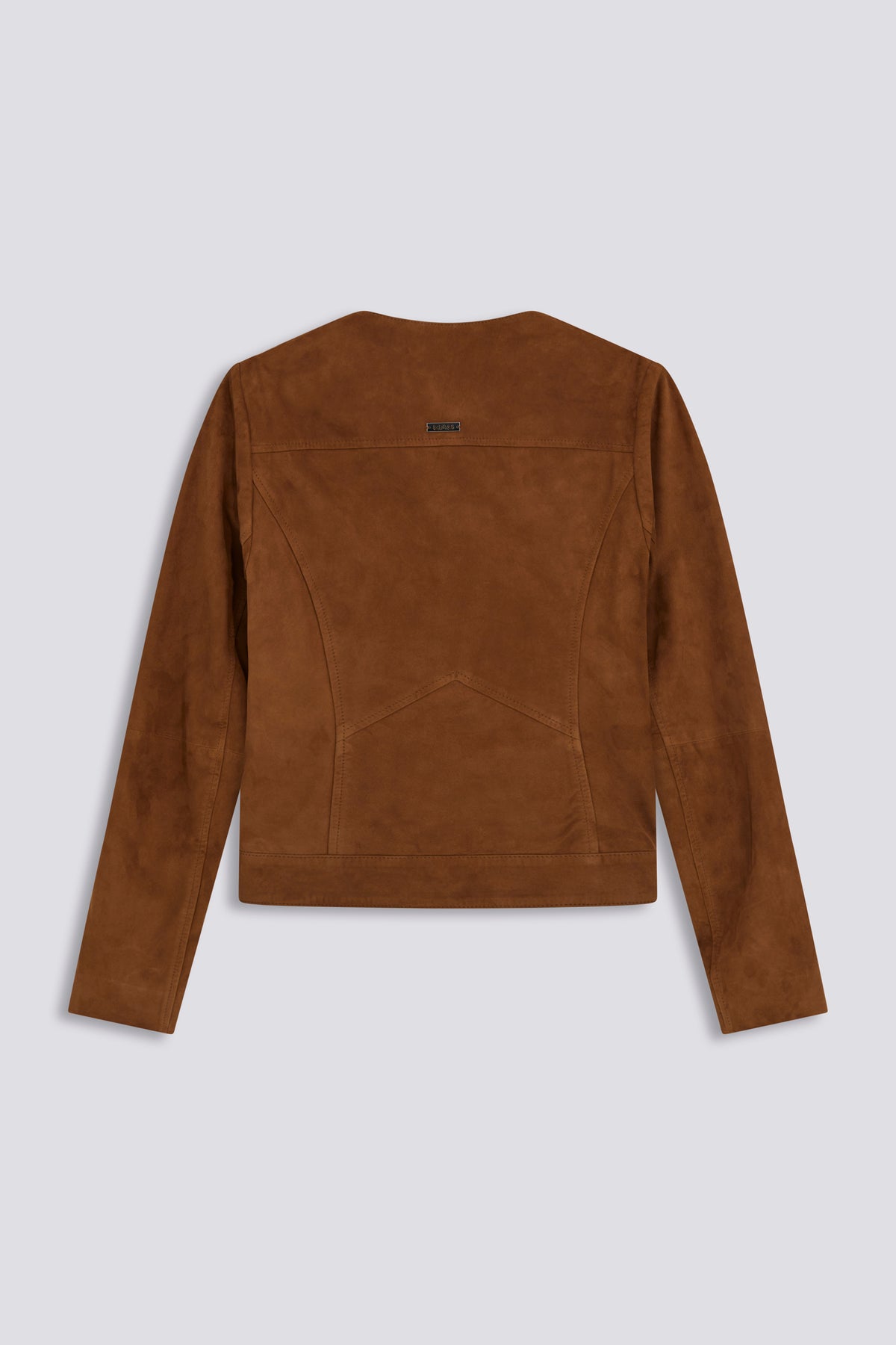 Damen-Bikerjacke aus weichem Veloursleder, konzipiert für die warme Jahreszeit mit markantem Charakter. Das schlichte, kragenlose Design erinnert an einen On-the-Road-Stil zwischen Wüstenrennen und endlosen Roadtrips. Die Ziernähte an den Schultern setzen einen authentischen Akzent, während die Logo-Plakette aus Metall auf der Rückseite das Modell kennzeichnet. Ein sommerliches Outerwear, das freien Geist und entspannte Weiblichkeit vereint und ideal zu leichten Denim und Häkel-Tops kombiniert werden kann.