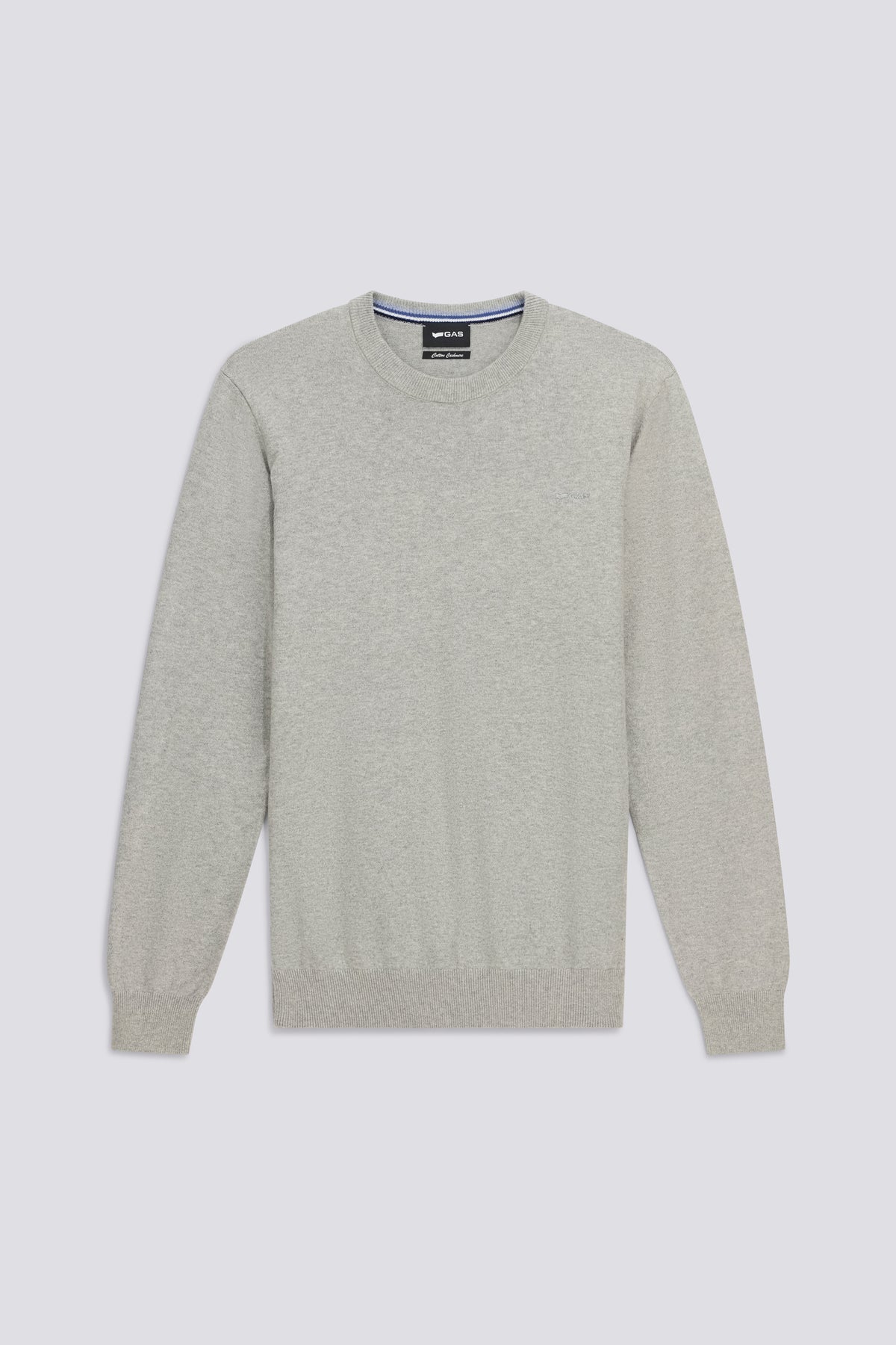 Herren Slim Fit Pullover mit Rundhalsausschnitt aus weicher Baumwolle-Kaschmirmischung, veredelt mit GAS Stickerei auf Herzhöhe. Ein raffiniertes Winter-Essential, perfekt allein oder unter einer Jacke.