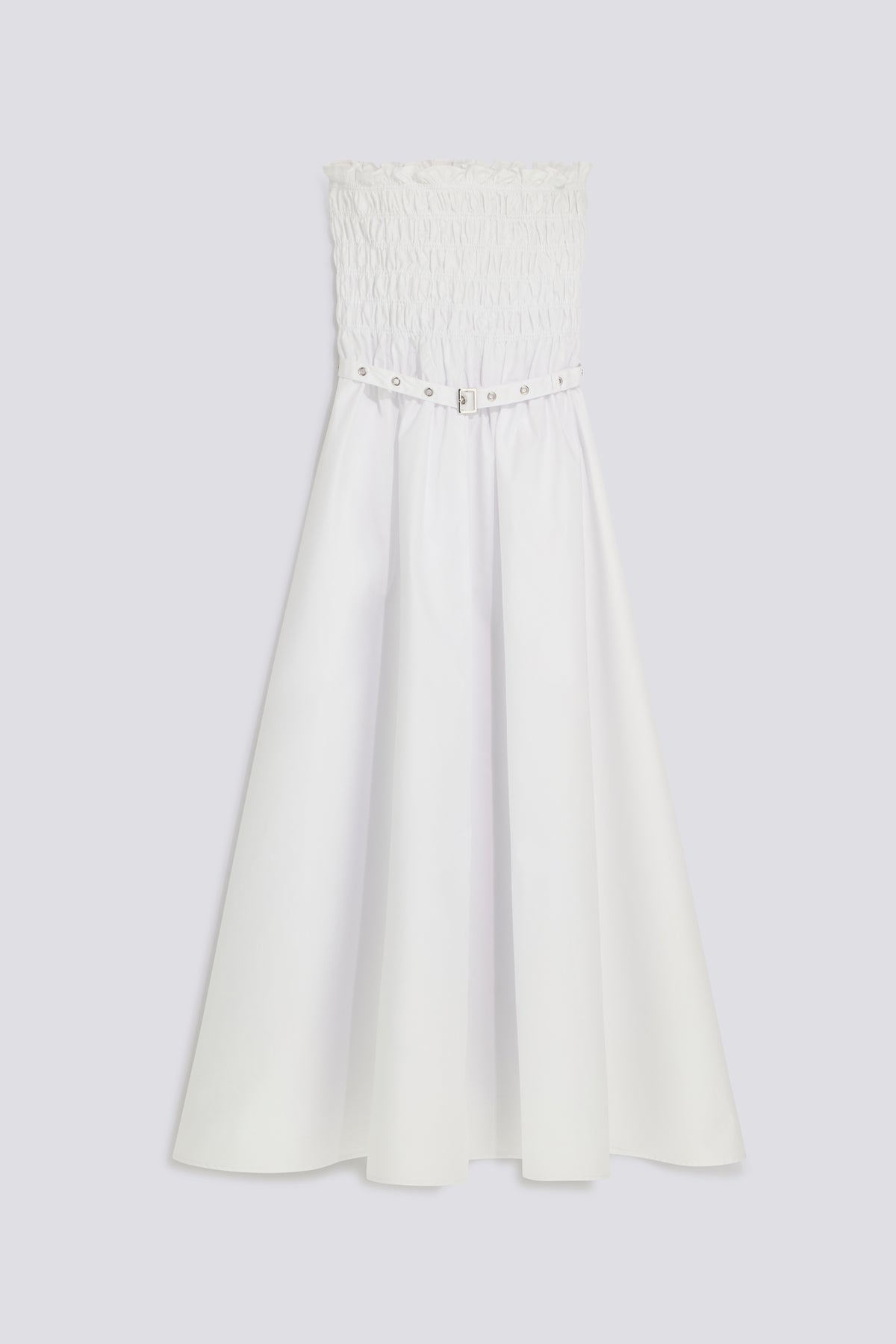 Long dress with a fluid silhouette and smocked bodice, creating an elastic and structured texture. The matching fabric belt at the waist defines the shape and adds a subtle graphic detail. The skirt opens with soft volume, enhancing movement. An essential yet distinctive piece, designed for effortless everyday elegance.