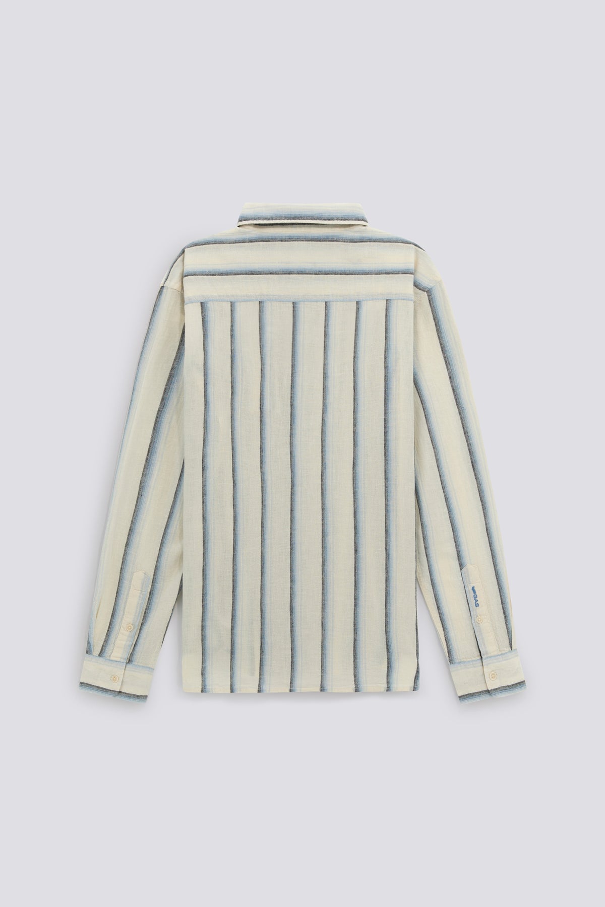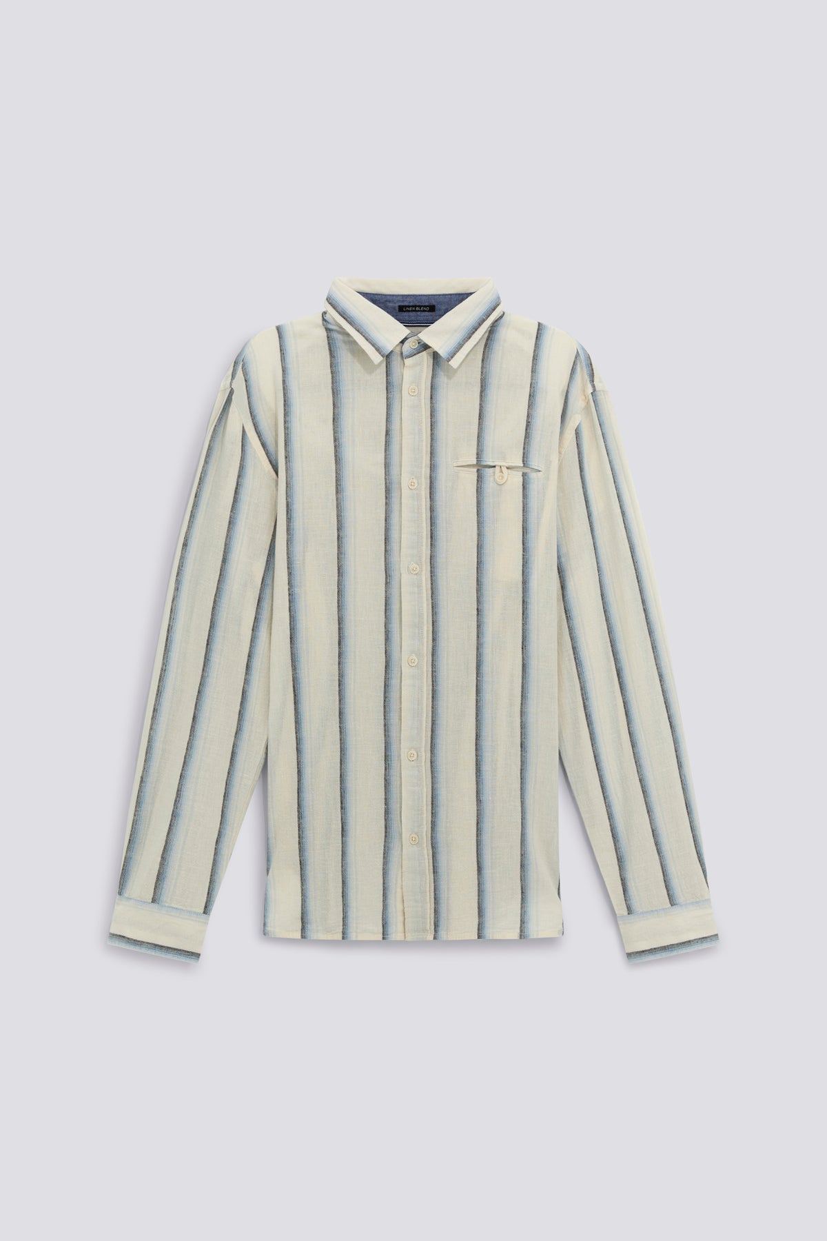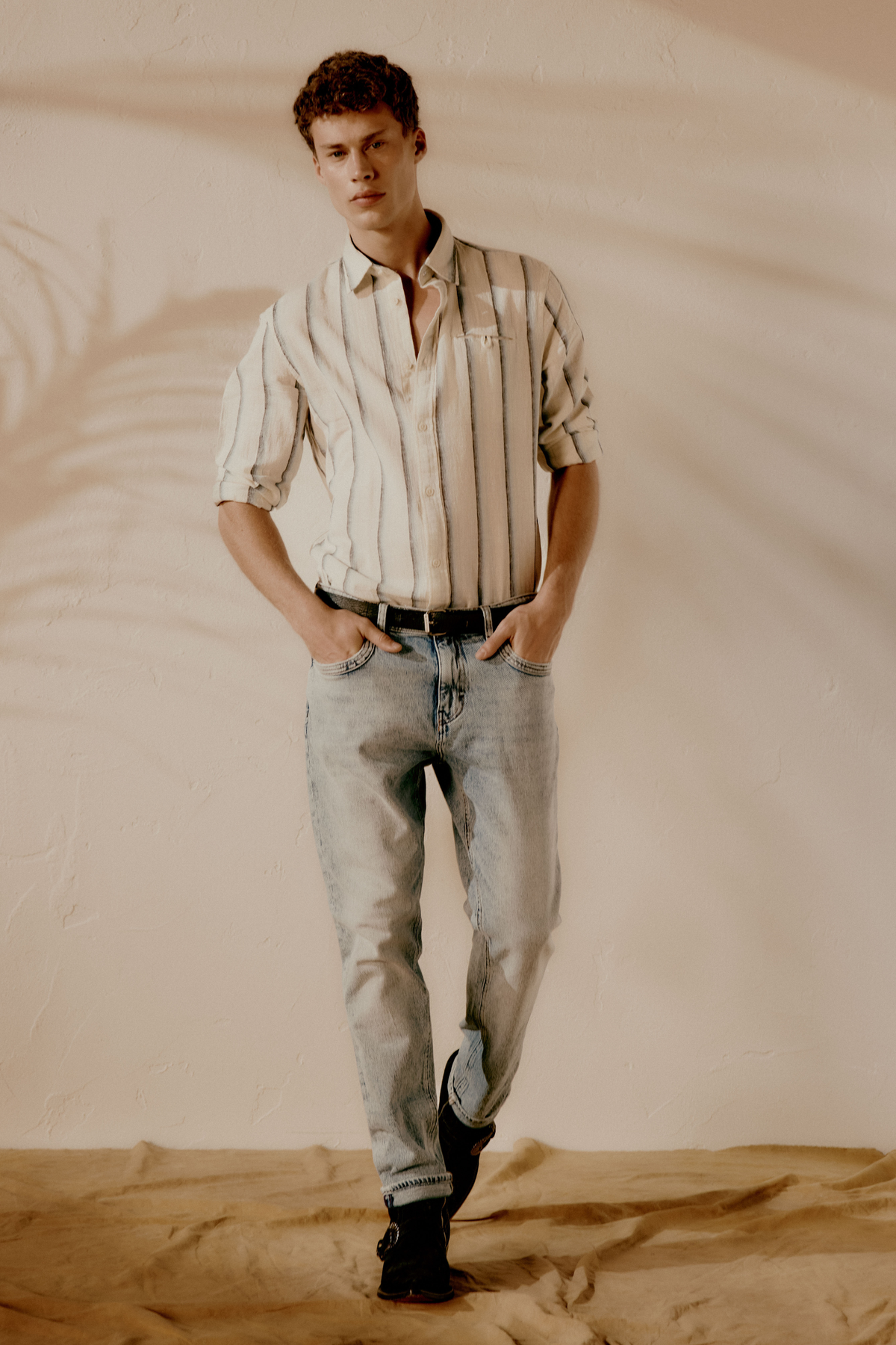 Men’s long-sleeve shirt in a regular fit, crafted from yarn-dyed cotton-linen fabric with a vertical stripe pattern. The style features a logo embroidery on the right sleeve, an internal chambray trim, and a striped tape inside the collar. A lightweight and versatile piece, designed for a clean and refined summer look.
