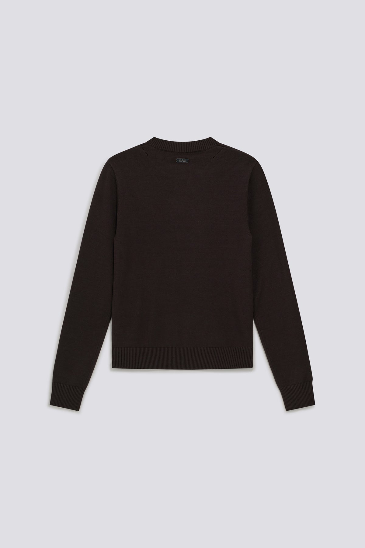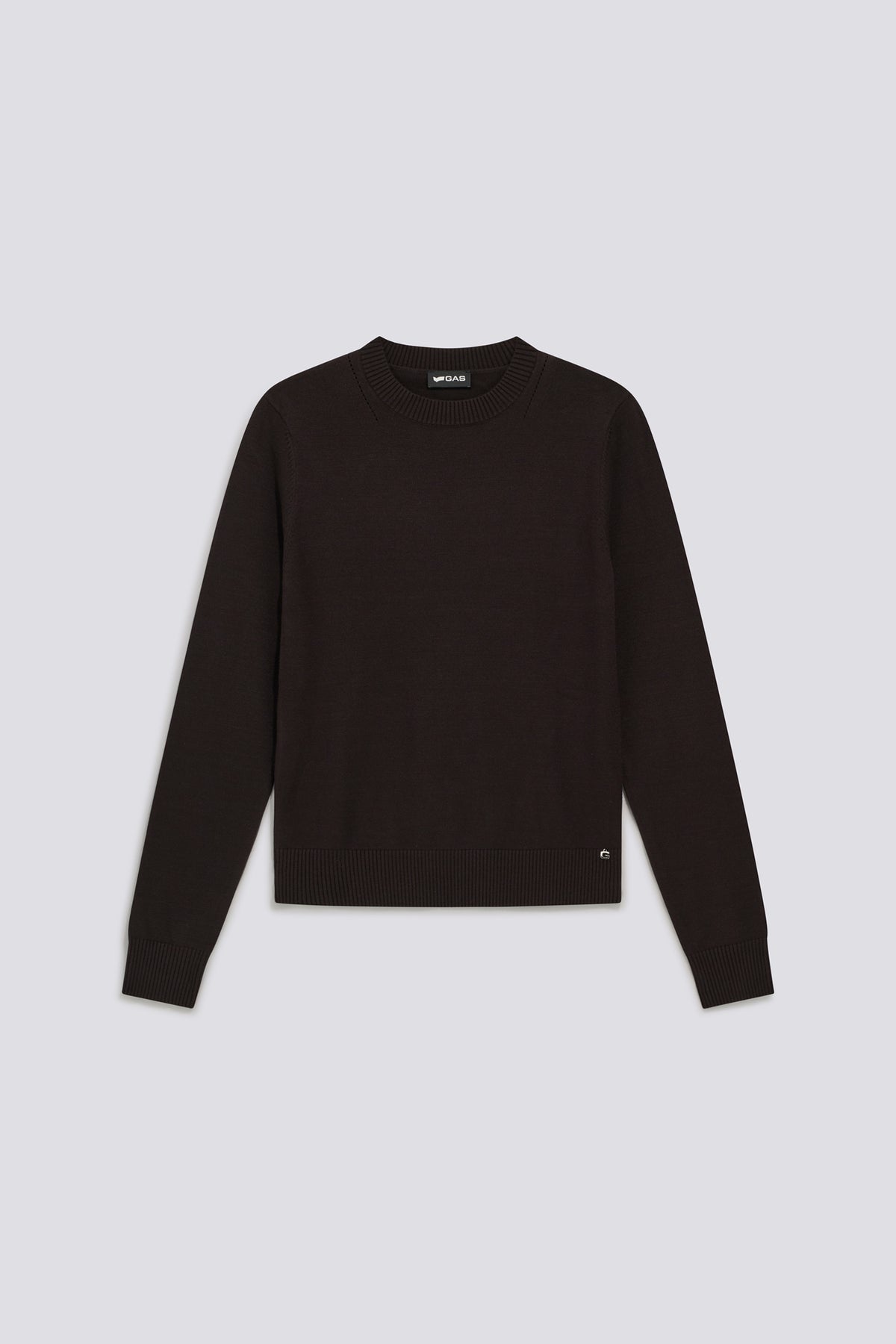 Women's crew-neck slim fit sweater in lightweight viscose-blend yarn, 12-gauge. An essential piece with a clean design, created to complement everyday and polished looks. The lightweight yarn makes it ideal to wear on its own or layered under blazers and seasonal jackets. The piece is detailed with a metallic "G" pendant at the front hem and a logo plaque at the back of the neck, subtle accents for a refined touch.