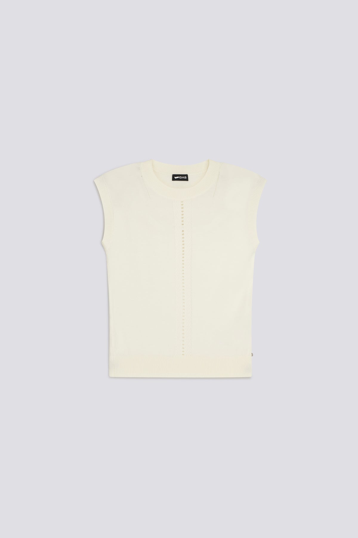 Sleeveless knit top with a slim fit, made from lightweight viscose yarn. The minimalist design is enhanced by a central openwork pattern that adds character to the piece. Metallic details complete the look: the “G” pendant at the hem and the logo plaque at the back. Perfect to wear on its own or layered under lightweight jackets for a sophisticated look.
