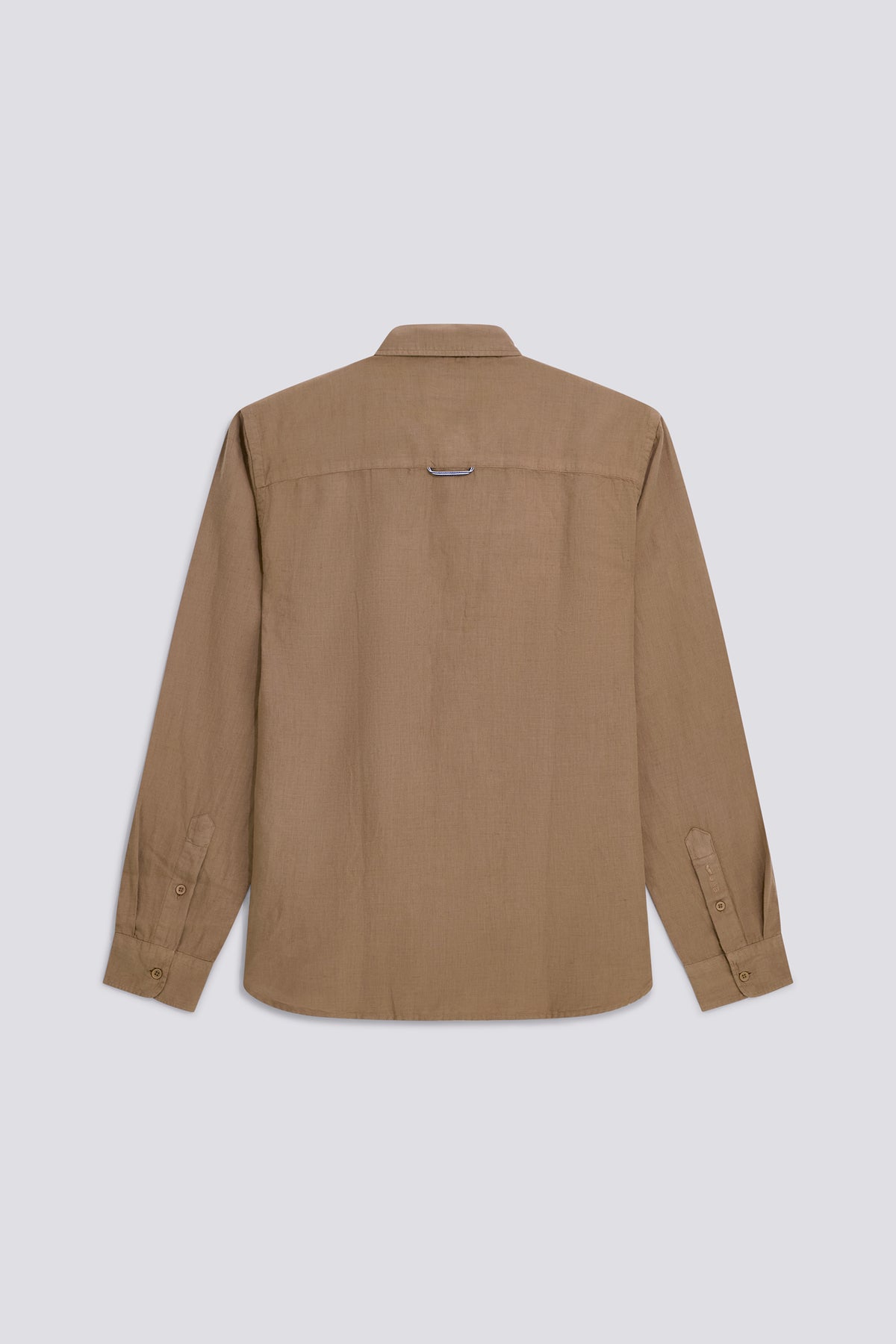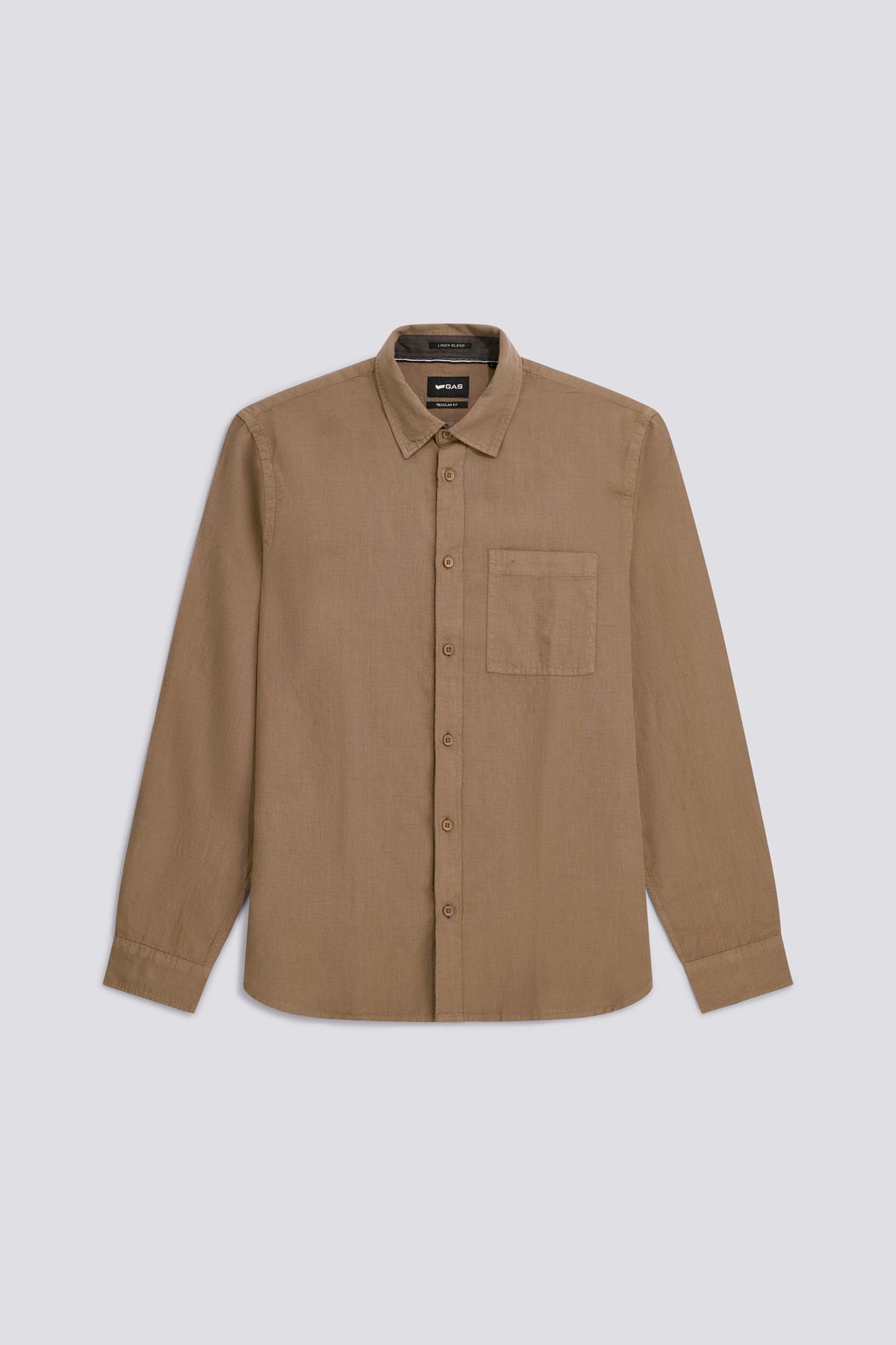 Long sleeve regular fit shirt in garment-dyed cotton-linen. The style features a clean construction enhanced by refined details such as logo embroidery, chambray on the inner collar band, and striped tape inside the collar and as a loop on the back yoke. A lightweight and versatile piece designed for an effortless, well-finished summer look.