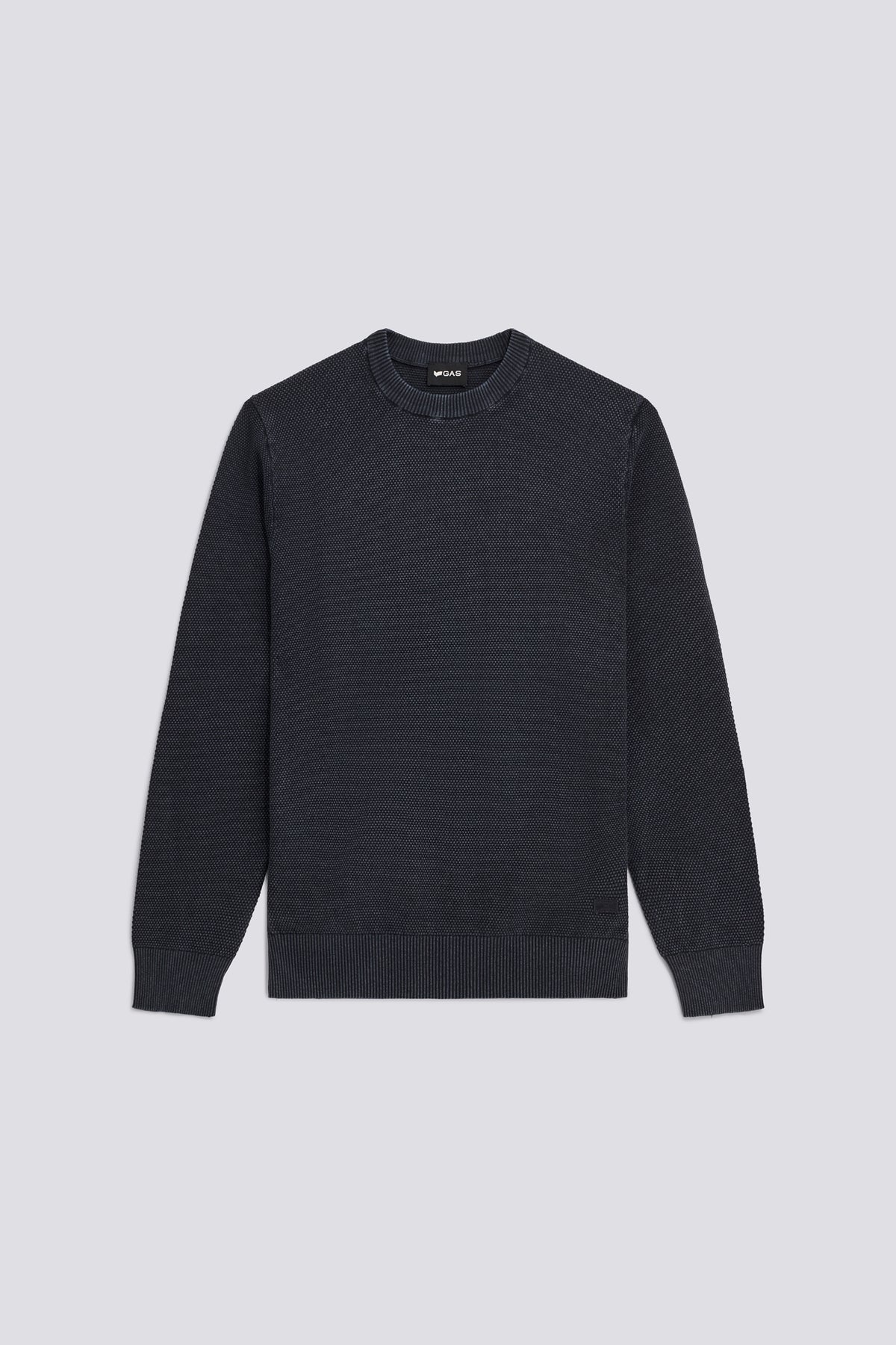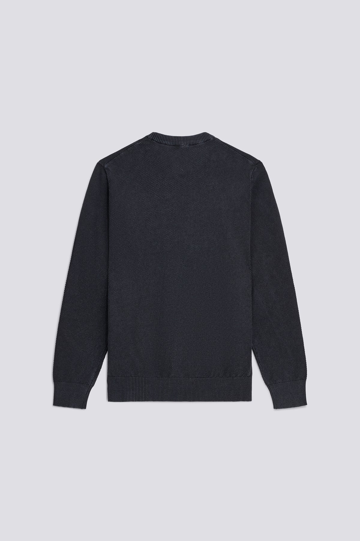 Men’s crew neck sweater made from 12-gauge cotton with cob stitch detailing and acid dye treatment. The process gives the color a lived-in effect, while the regular fit makes it a versatile piece ideal for transitional seasons. The design is finished with a logo embroidery on the chest.