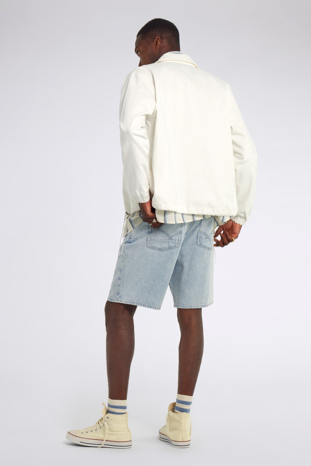 Men’s denim shorts with a loose fit, made from 10.00 OZ cotton-lyocell fabric. The light wash with subtle abrasions on the pocket edges and hem recalls the aesthetics of the 1990s. An authentic piece that reflects the brand's heritage.