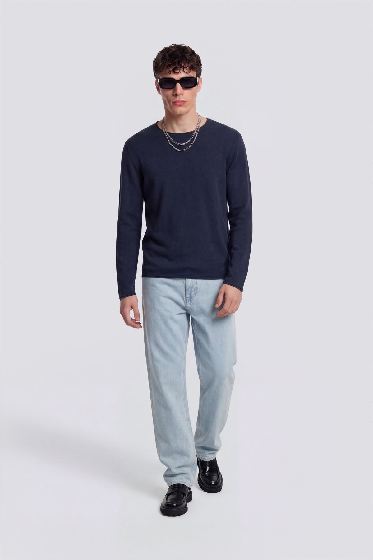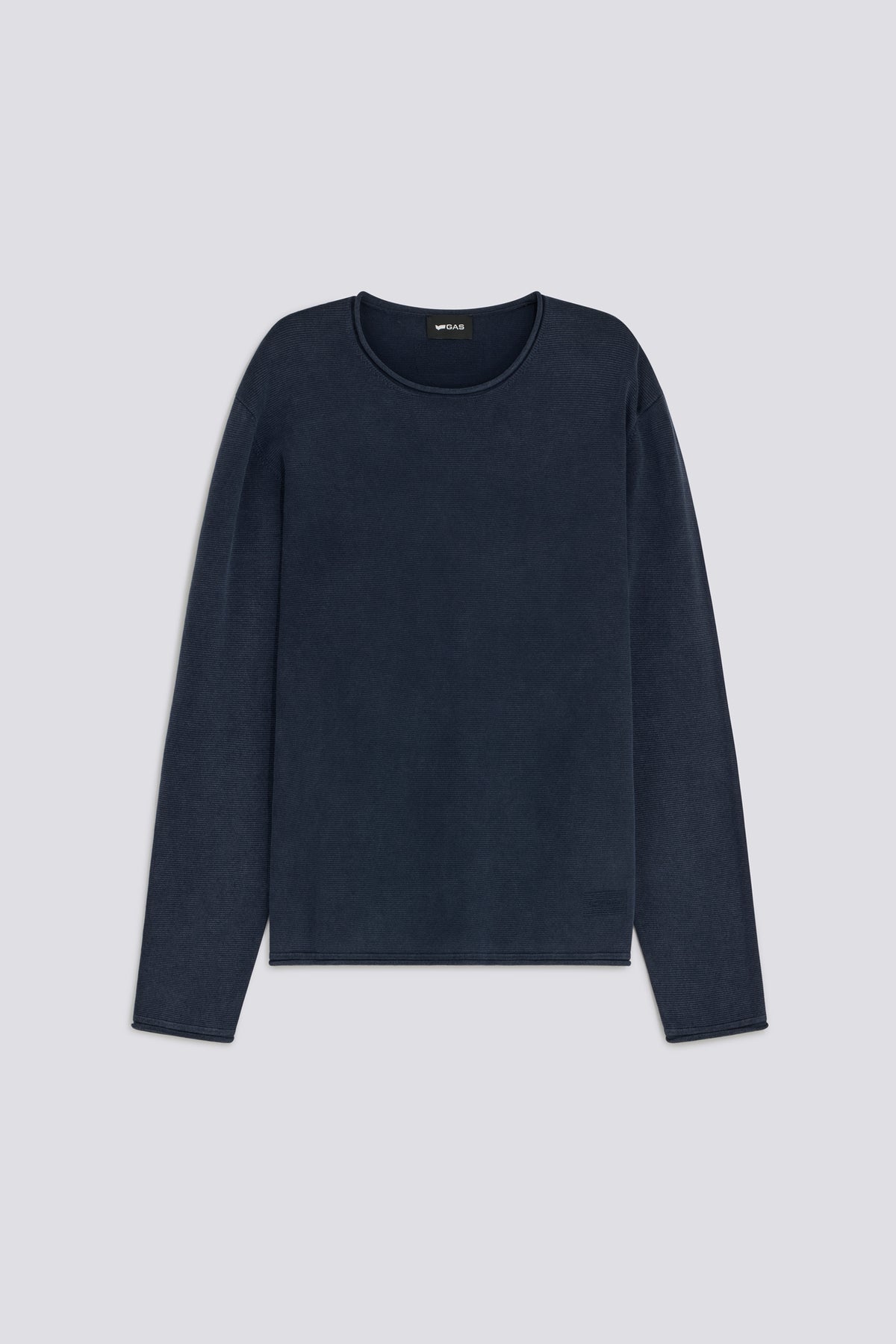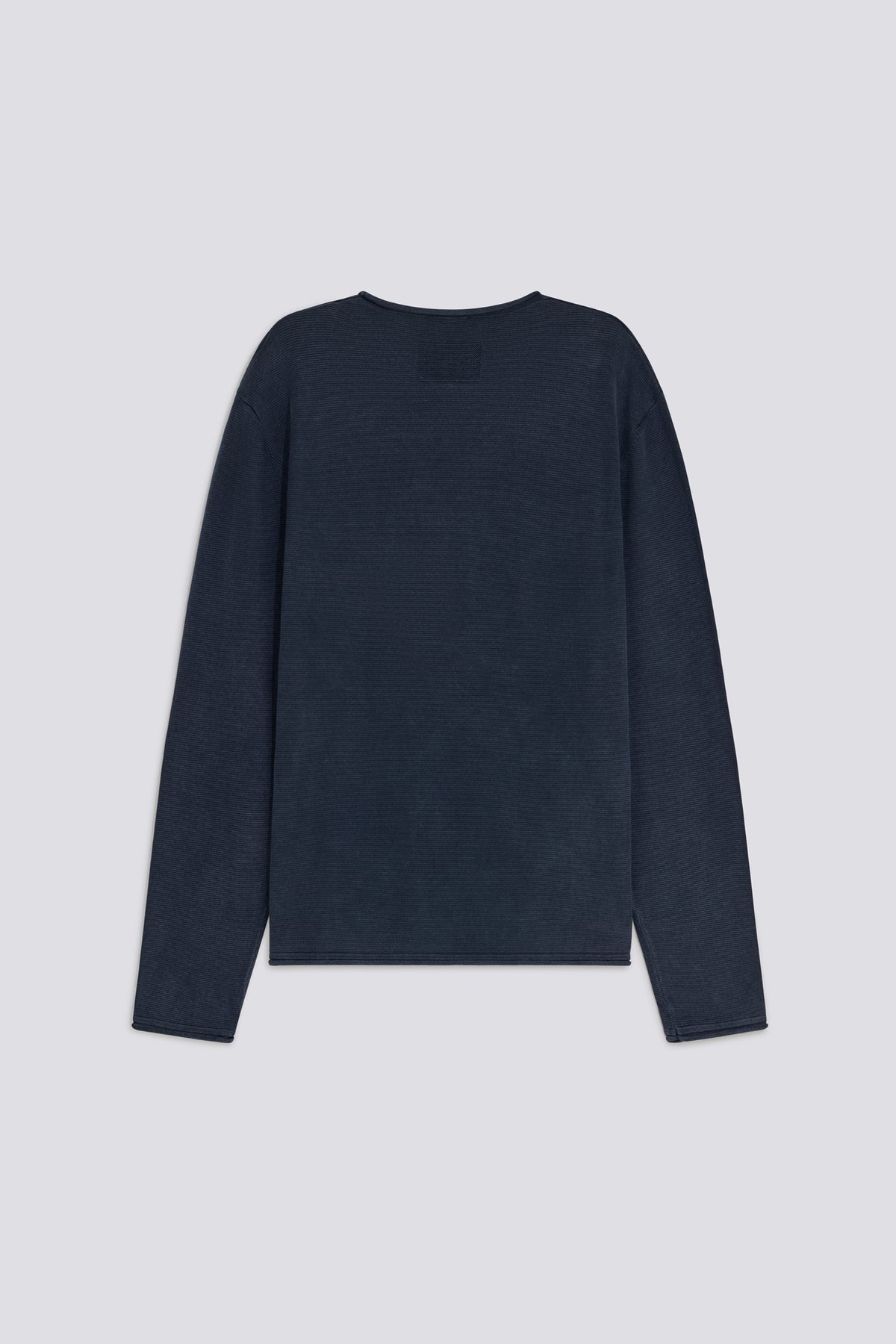 Regular fit crew neck sweater in 12-gauge cotton with links stitch construction. Baby roll details on the collar and hem create a lighter profile, while the garment-dyeing process gives the color a slightly irregular depth. Logo embroidery on the insert at the lower left front signs off the piece. Main Features: