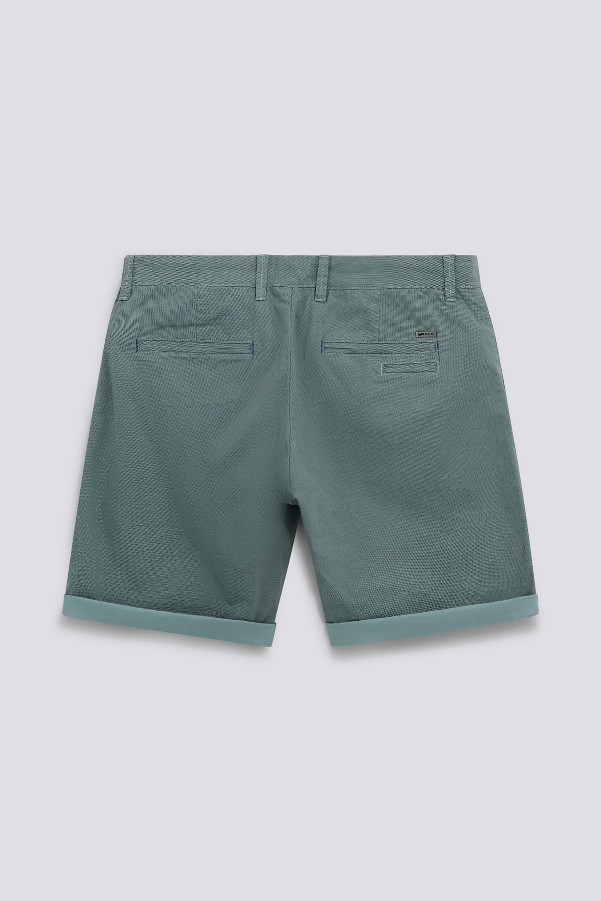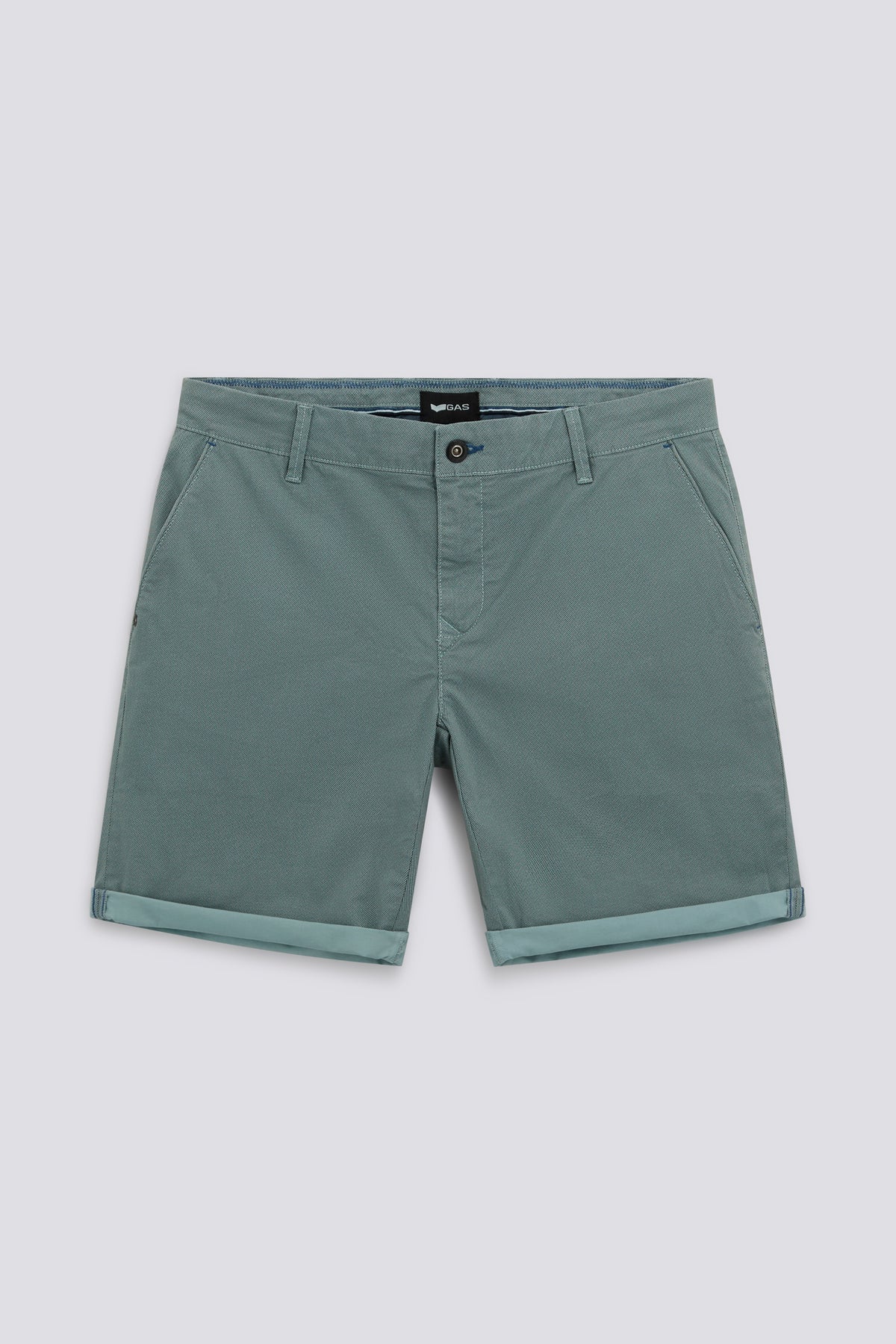 Men's slim-fit shorts made from stretch cotton gabardine with an all-over micro print. The turned-up hem defines the design, enhanced by internal chambray details, striped piping on the inner waistband, and a metal logo plaque above the right back pocket.