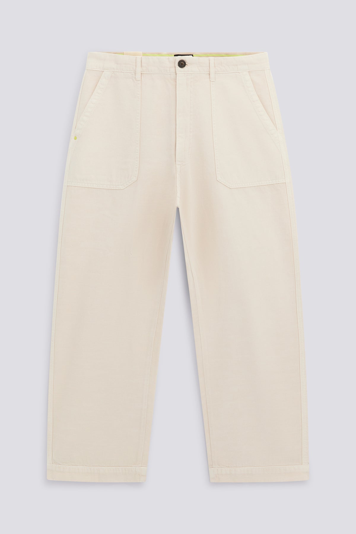 Men's baggy fit fatigue pants inspired by workwear. Made from garment-dyed cotton-linen fabric, they combine structure and lightness, with a cool feel perfect for the warmer season. The applied pockets reference a utility aesthetic, while the relaxed silhouette ensures comfort and freedom of movement. Main Features: