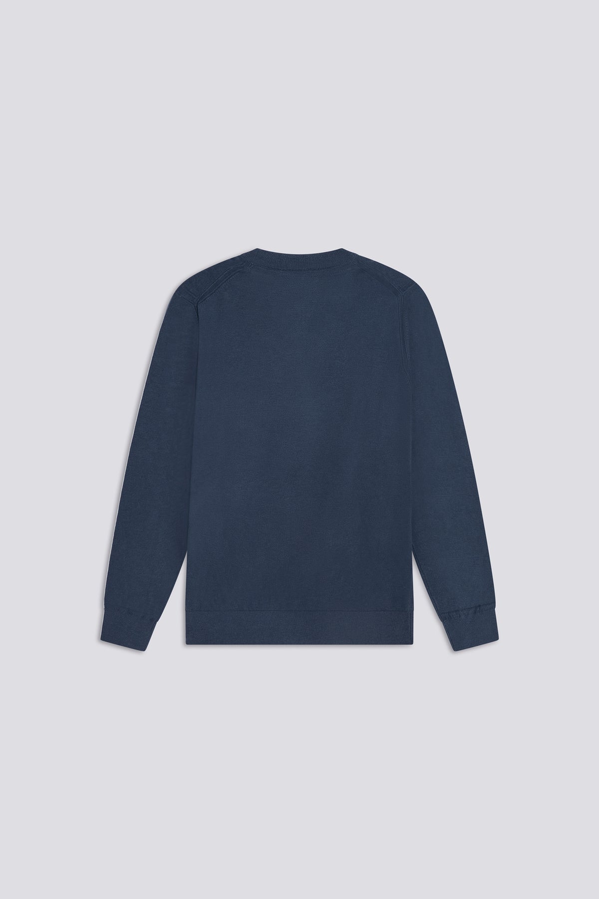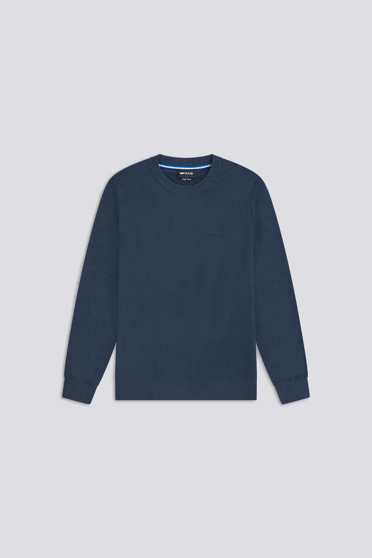Slim fit crew neck sweater in 12 gauge yarn, soft and light to the touch. The striped trim on the back of the neck and the tonal logo embroidery on the chest define the look. A clean essential, perfect under a blazer or alone with denim or chinos.