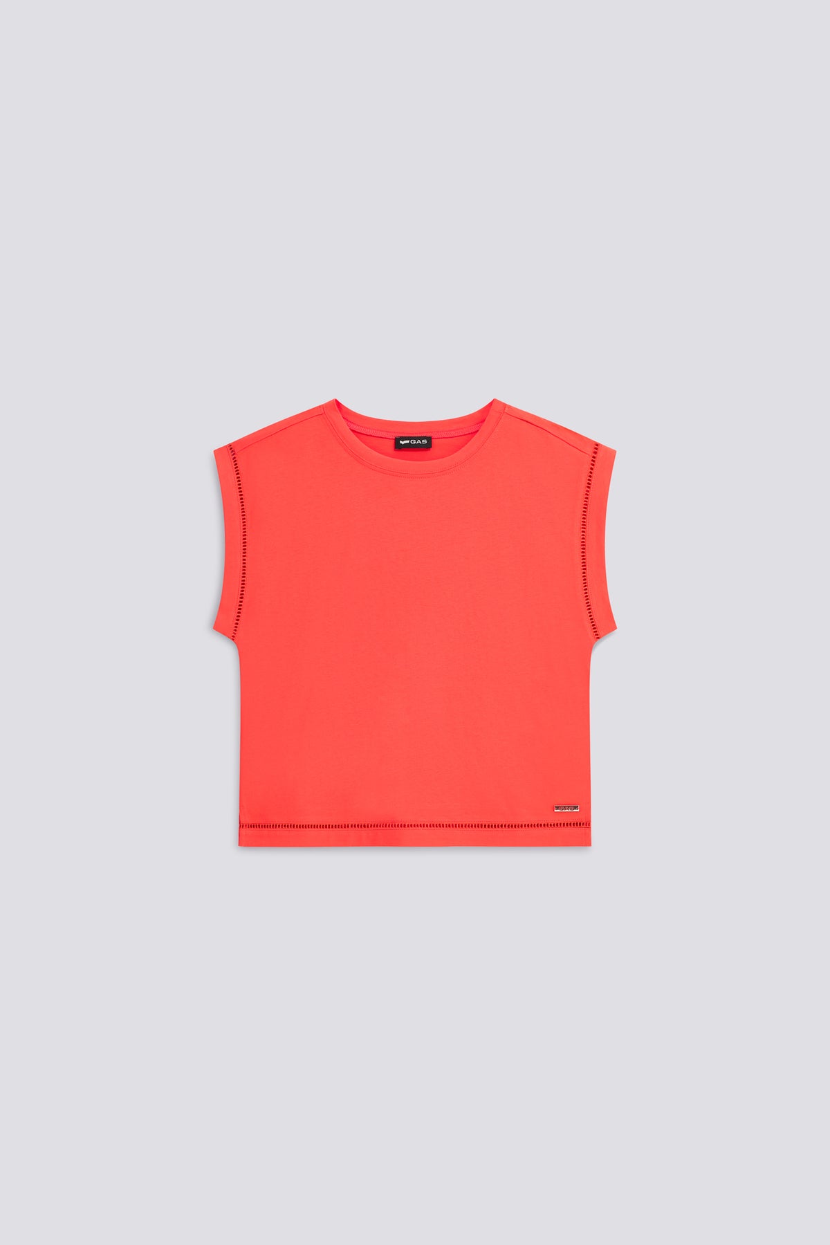 Short-sleeved T-shirt in cotton jersey with a regular fit. The ajour pattern on the hem and sleeves adds a refined, feminine detail, while the metal logo plate completes the design. A reimagined essential that brings a sophisticated twist to everyday looks.