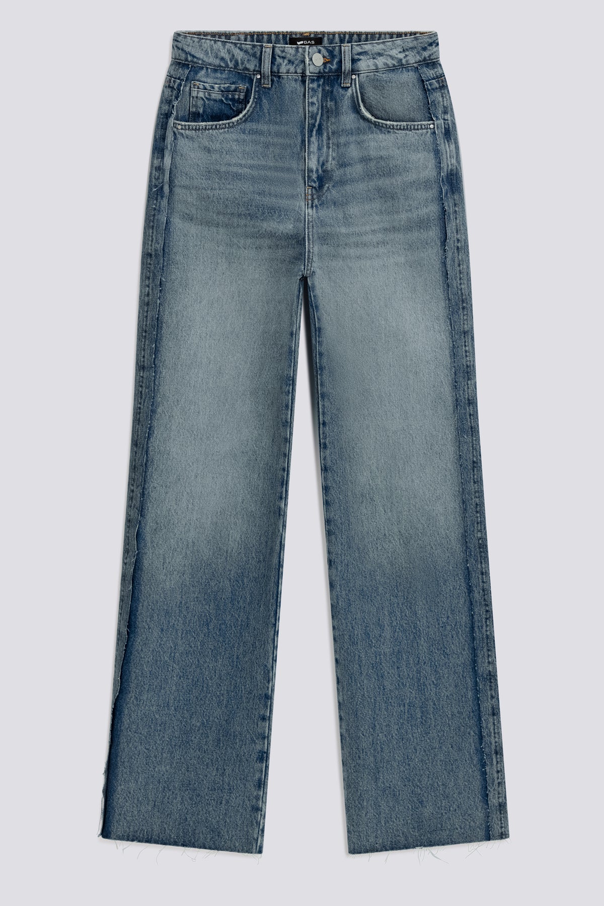 Women's wide fit jeans in blue indigo denim weighing 12.5 oz, with an authentic and lived-in look. The medium-light wash with slight edge abrasions gives a naturally worn effect, while the raw-cut waist adds a raw and contemporary touch. Perfect for creating casual looks with a strong personality.