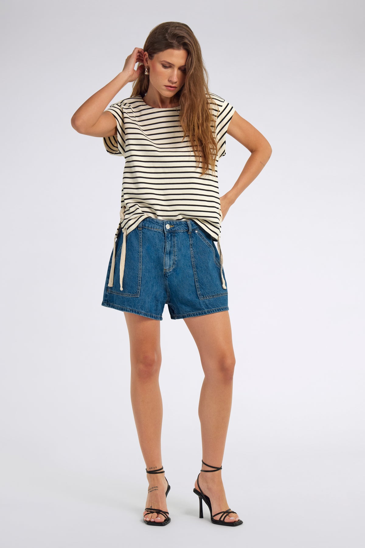 Women's comfort fit shorts in 12.00 OZ cotton-lyocell denim, featuring a utility-inspired style. The medium stone wash gives the garment an intense, authentic blue. The applied back pockets highlight the workwear character of the piece, making it a summer essential.