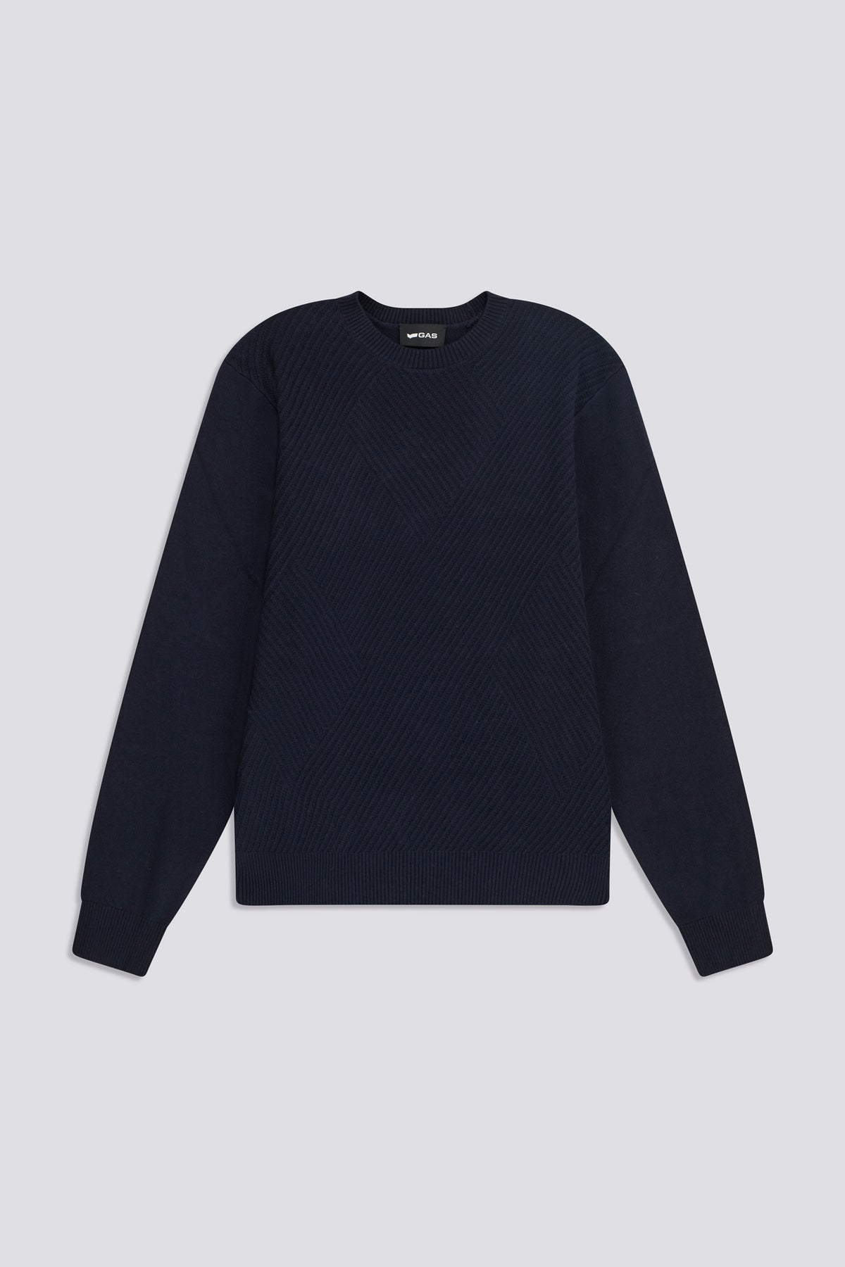 Crew neck sweater with a regular fit made from fine gauge cotton-wool yarn, featuring a raised geometric pattern on the front that adds character and structure. A versatile and sophisticated garment, finished with a metal logo plaque on the back neckline. Perfect for wearing with denim or chinos for a clean yet distinctive look.