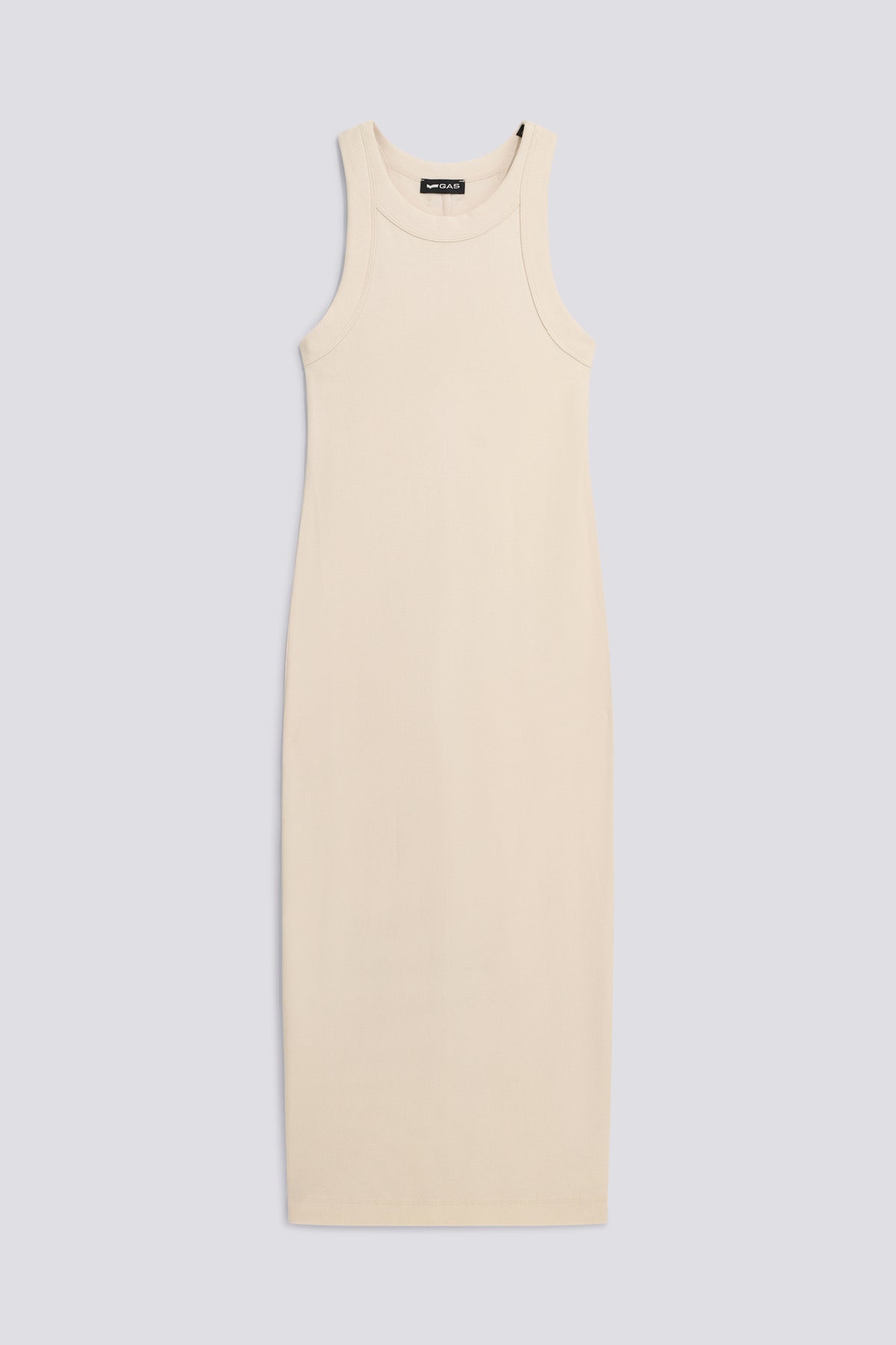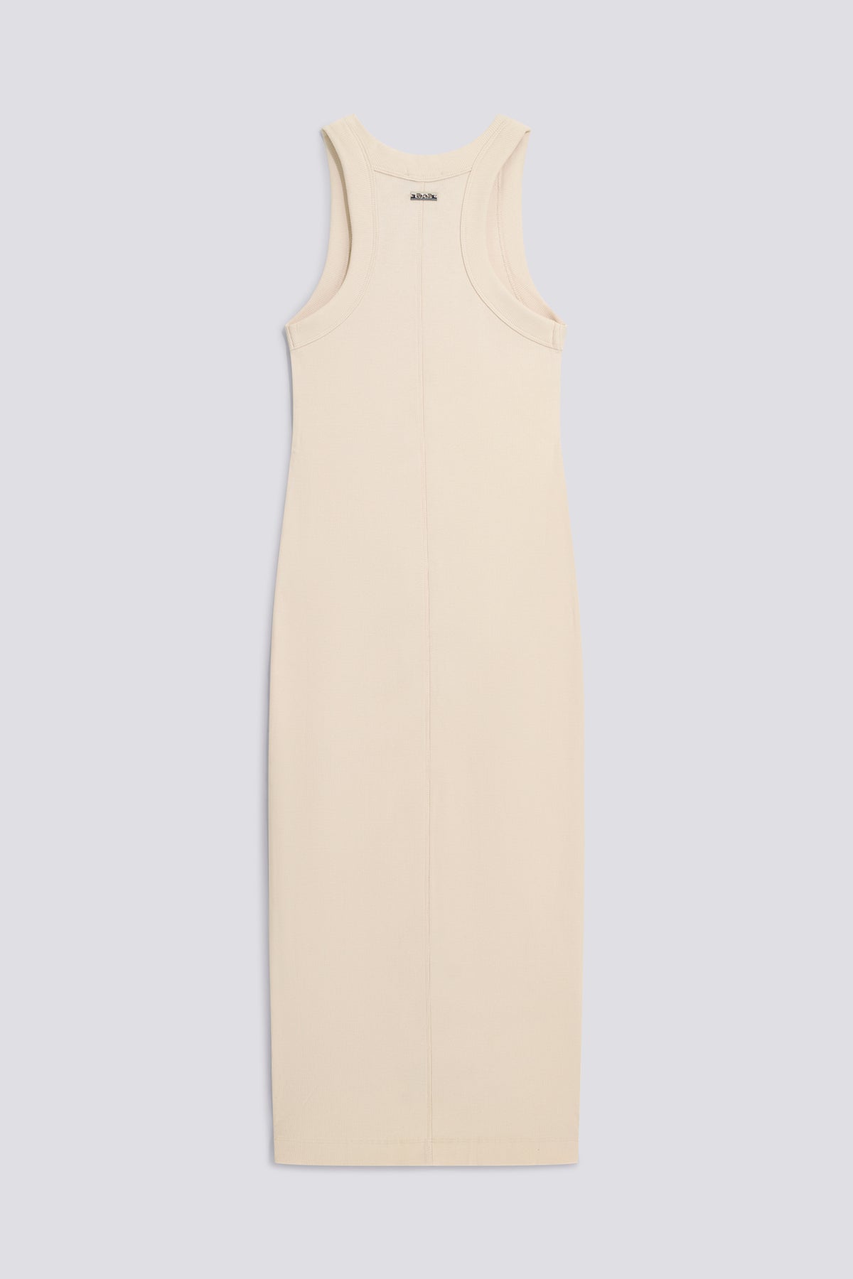 Long slim-fit tank dress in stretch ribbed fabric, form-fitting and feminine. The design is minimal and naturally enhances the silhouette, offering fluid movement. The logo plaque on the back distinguishes the piece, making it a versatile model suitable from day to night.