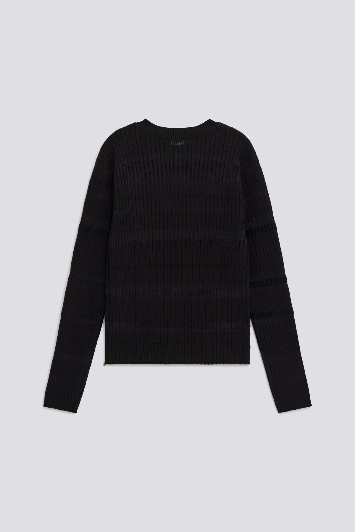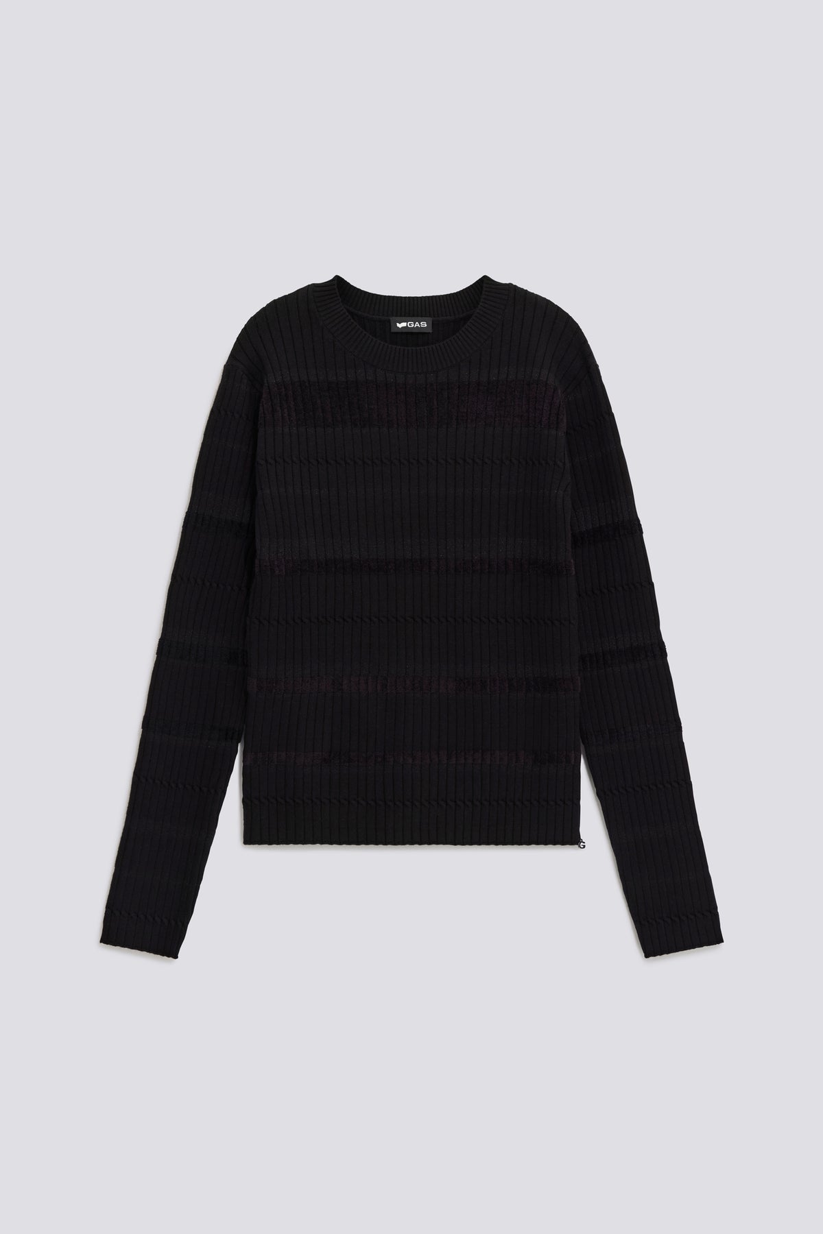 Jersey con cuello redondo slim fit en hilo mezclado con viscosa de finura 12, de tacto suave. La confección acanalada con rayas horizontales enriquecidas con insertos de lúrex le da un toque brillante y contemporáneo. Detalles icónicos como la placa del logo de metal en la parte trasera y el colgante 'G' en el lado lo convierten en un esencial elevado perfecto para el invierno.
