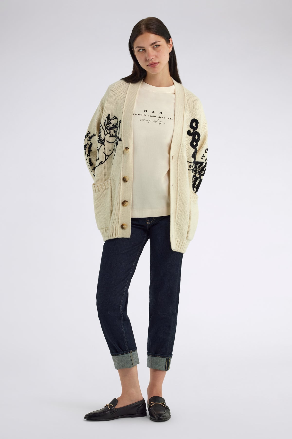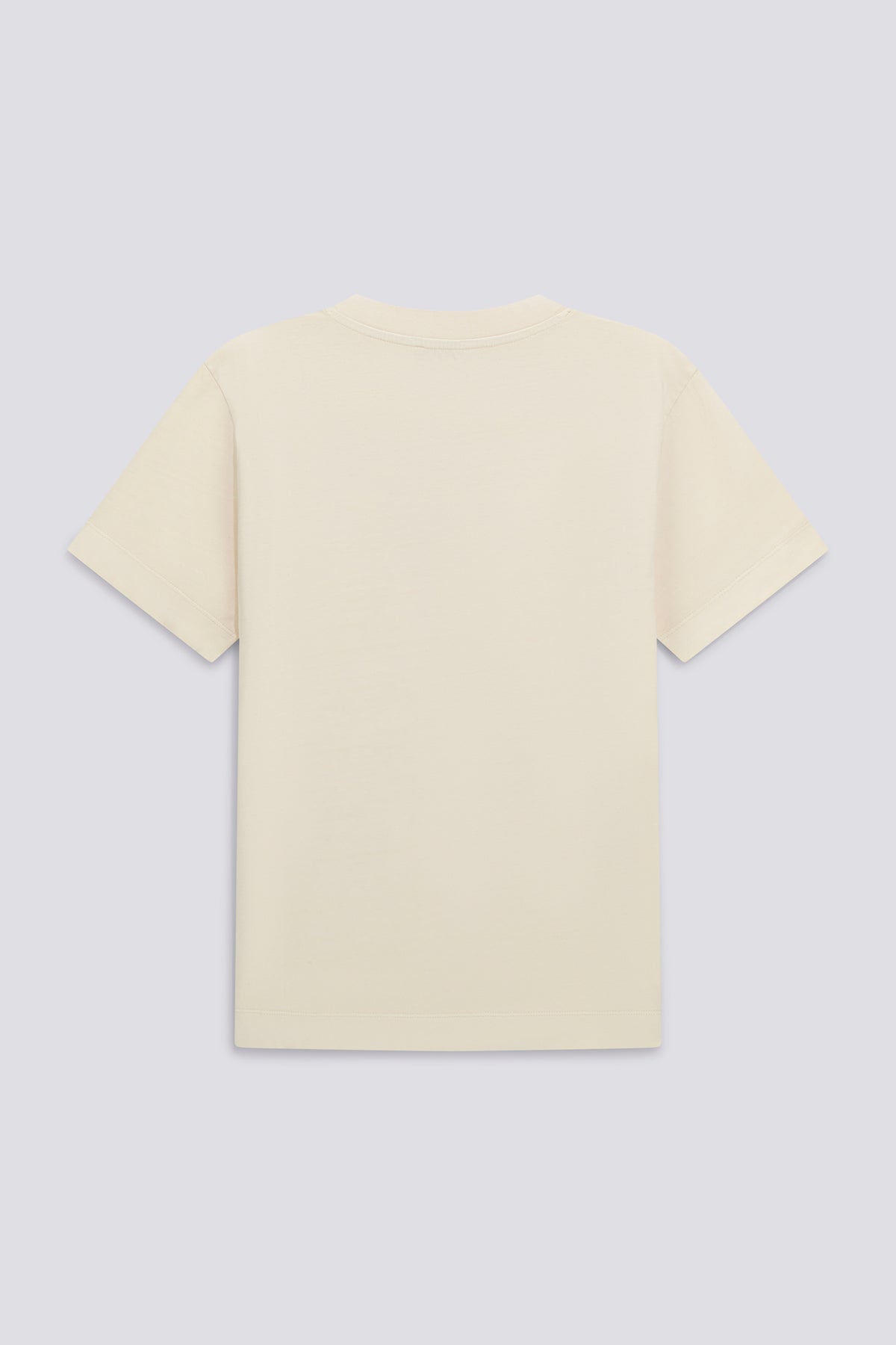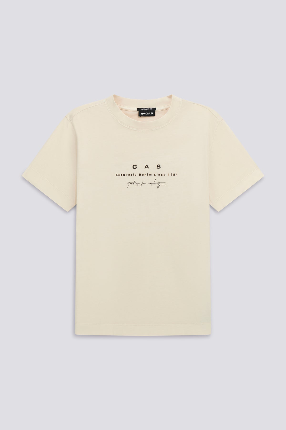 Camiseta de cuello redondo de corte recto en jersey 100% algodón, con un aspecto usado y auténtico. La impresión al agua con detalles flock en la parte delantera se combina con el teñido en prenda efecto envejecido para una estética de carácter decidido.