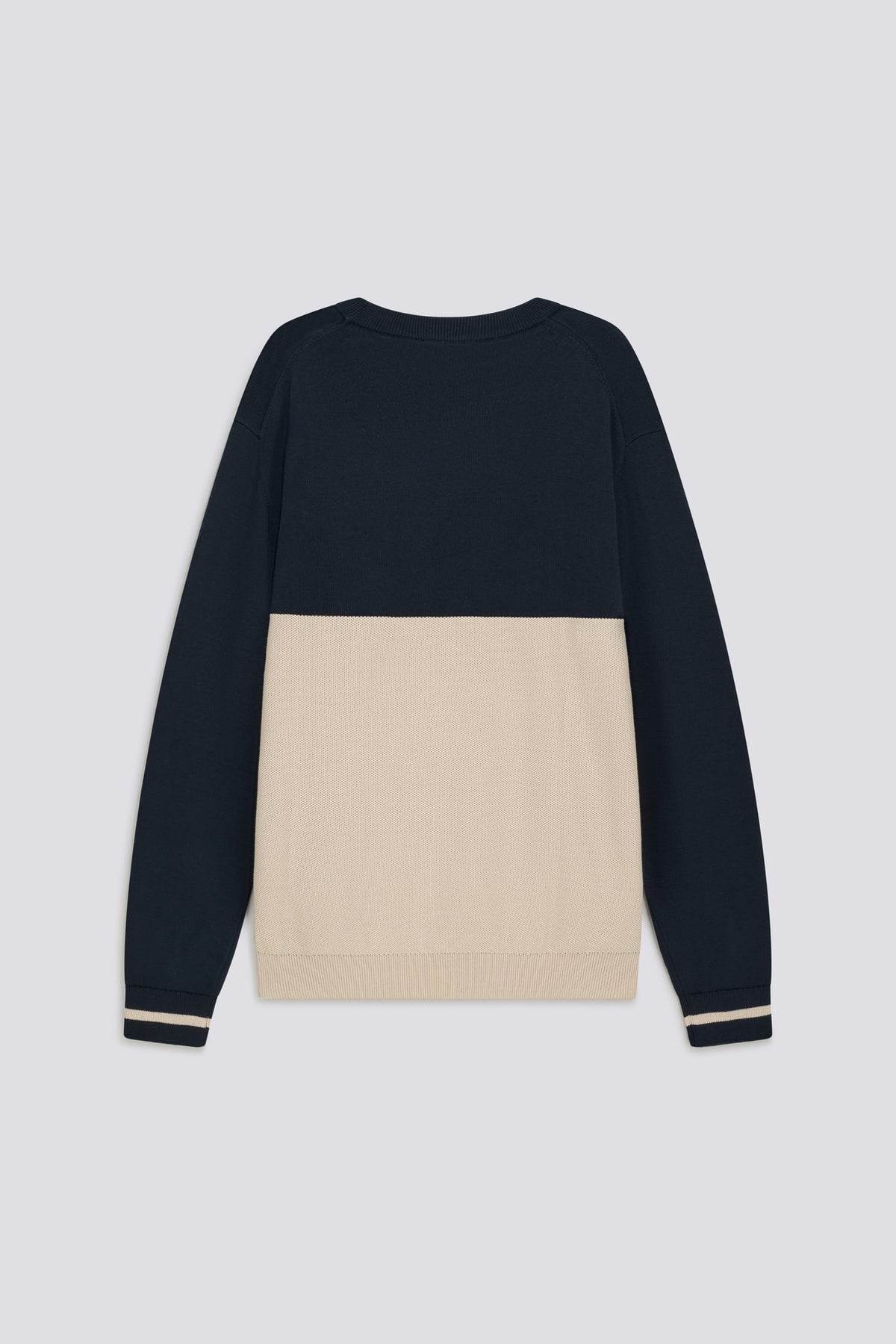 Pullover homme col rond coupe regular en coton jauge 12, avec design color block et finition en point piqué. Pièce polyvalente, agrémentée du logo brodé sur la poitrine.