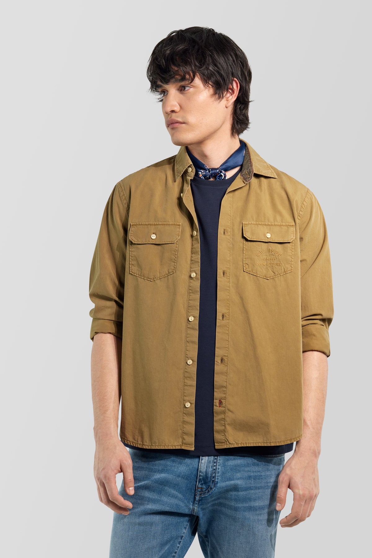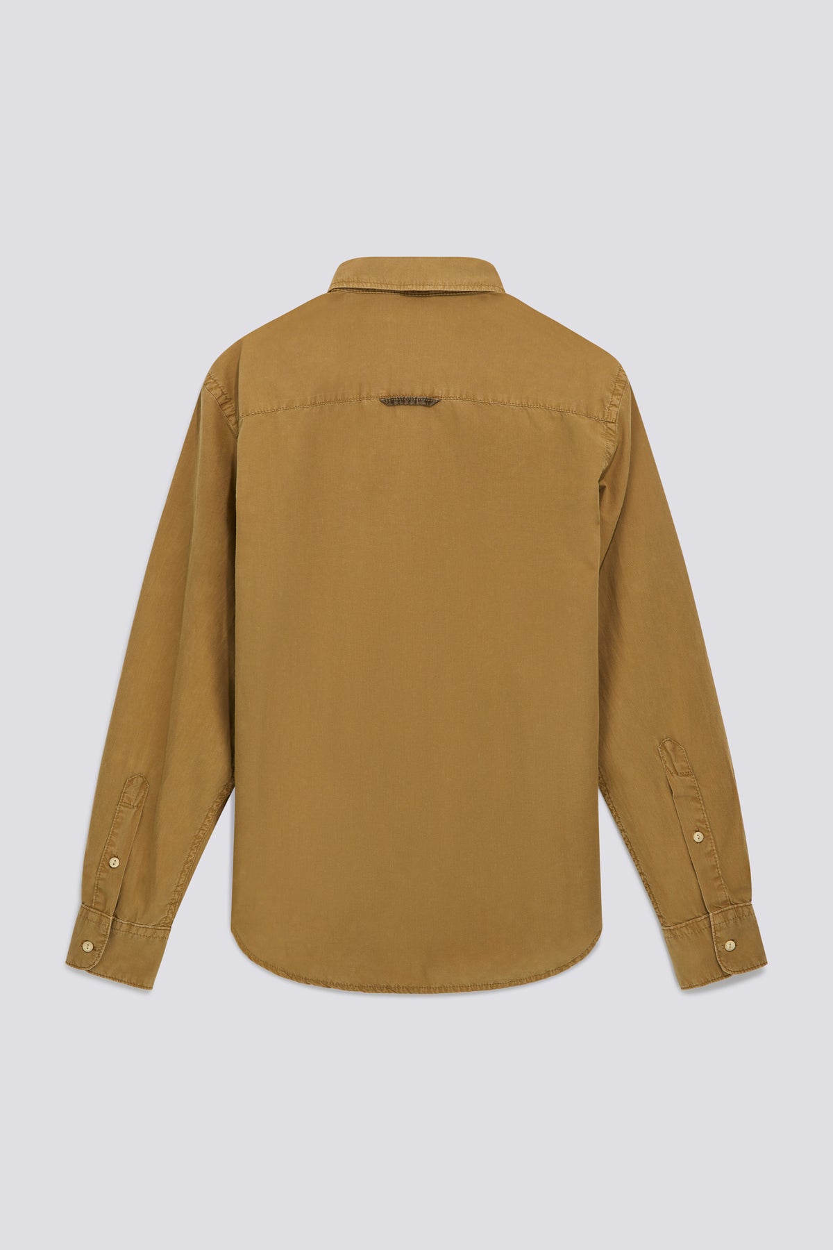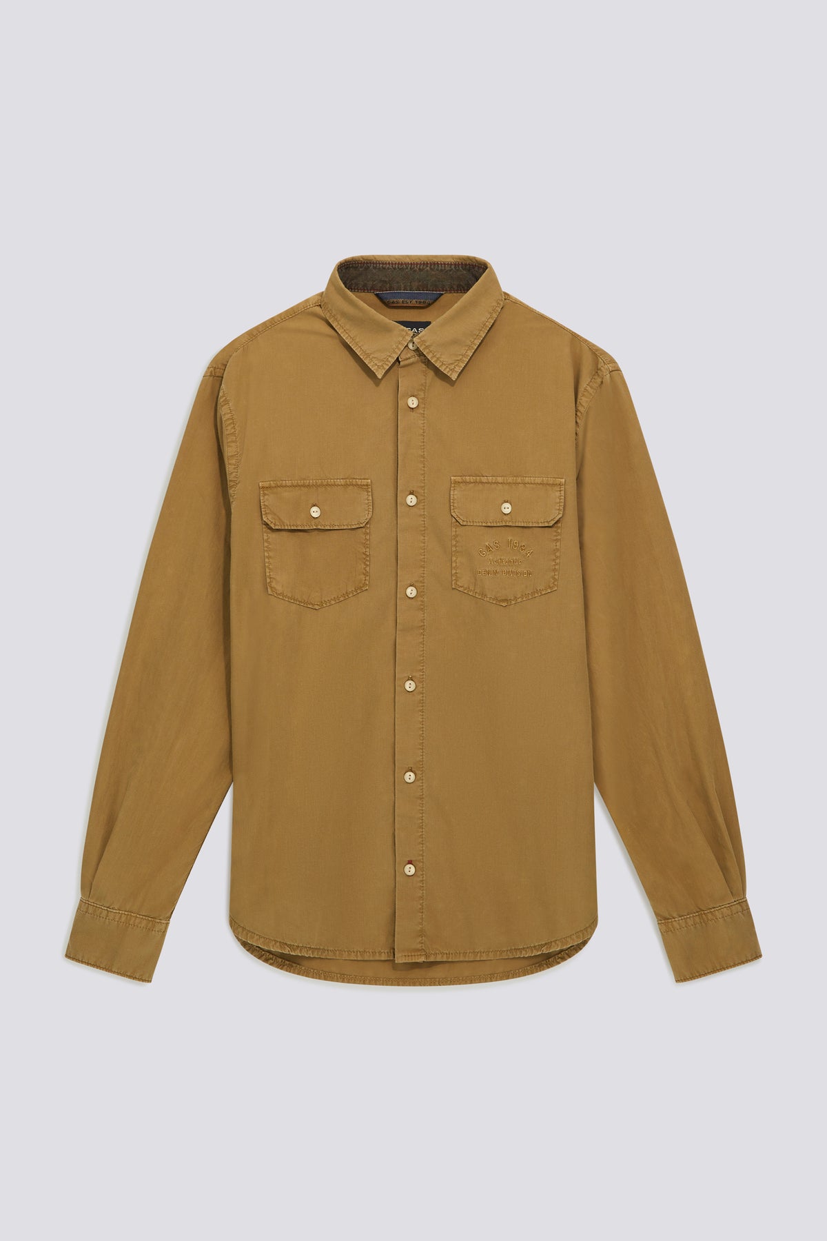 Férfi regular fit munkaruházati ing könnyű, átlós pamutból, ruha festéssel. A munkaruházati egyenruhára utaló elemek, alkalmazott zsebek és logózott szalag teszik a ruhadarabot lényegessé, mégis részletekben gazdaggá.