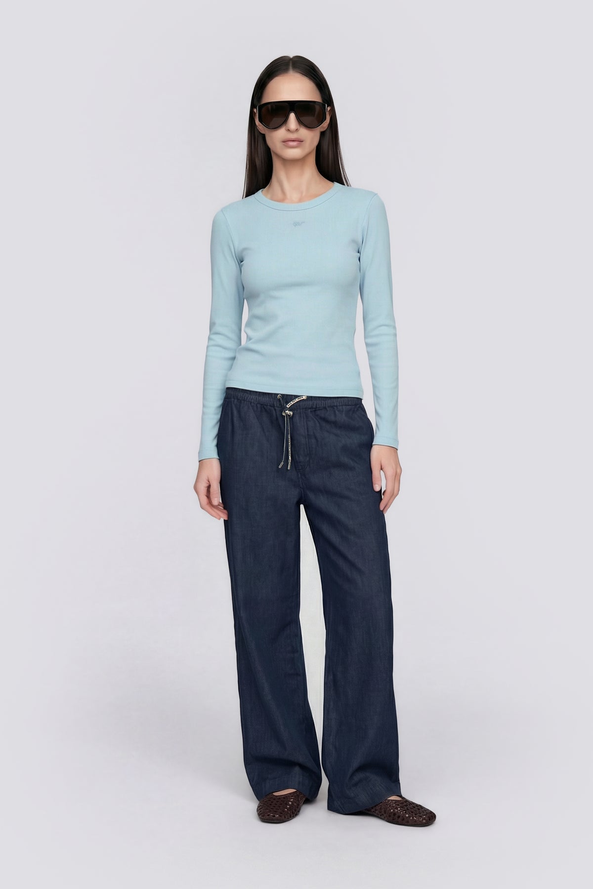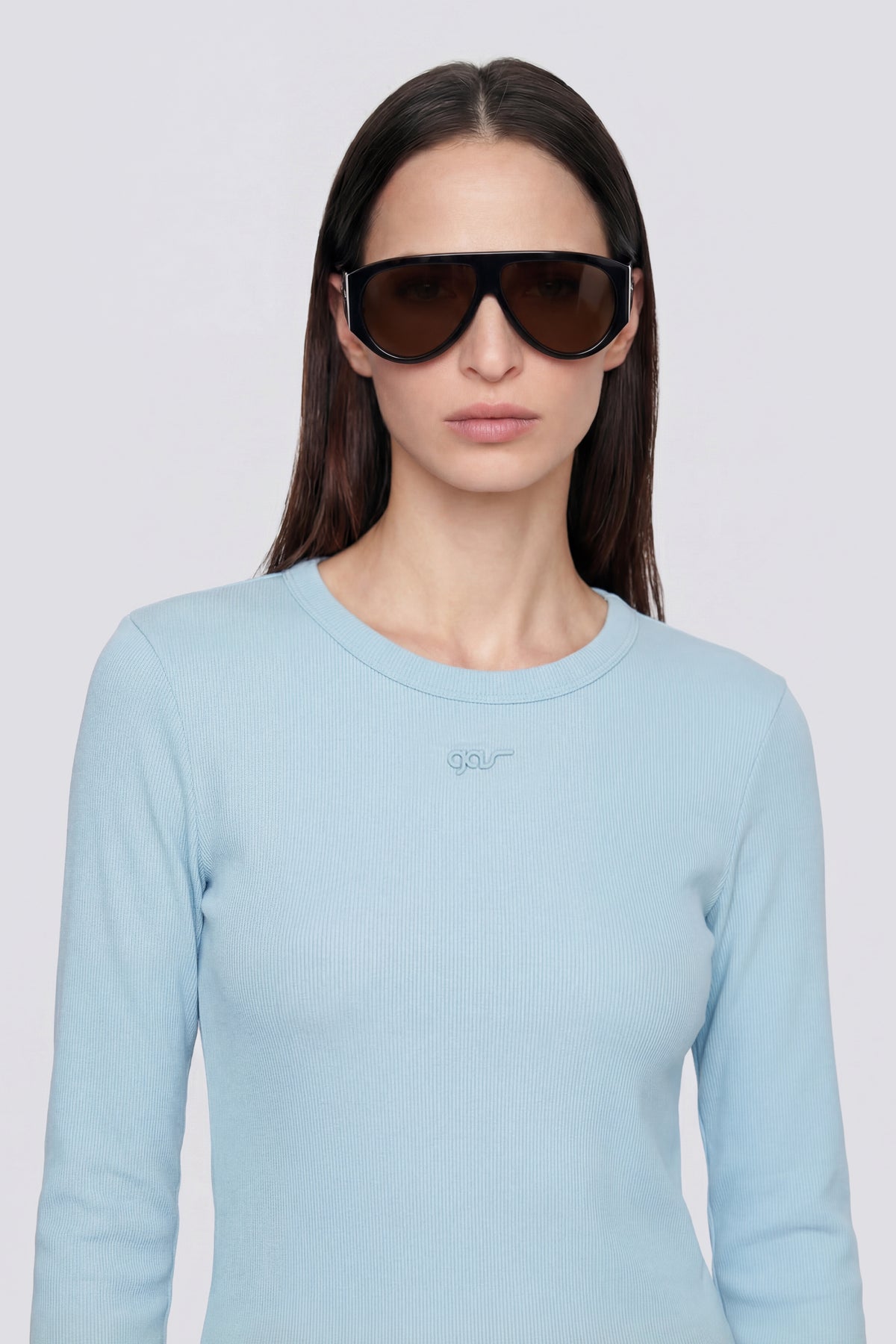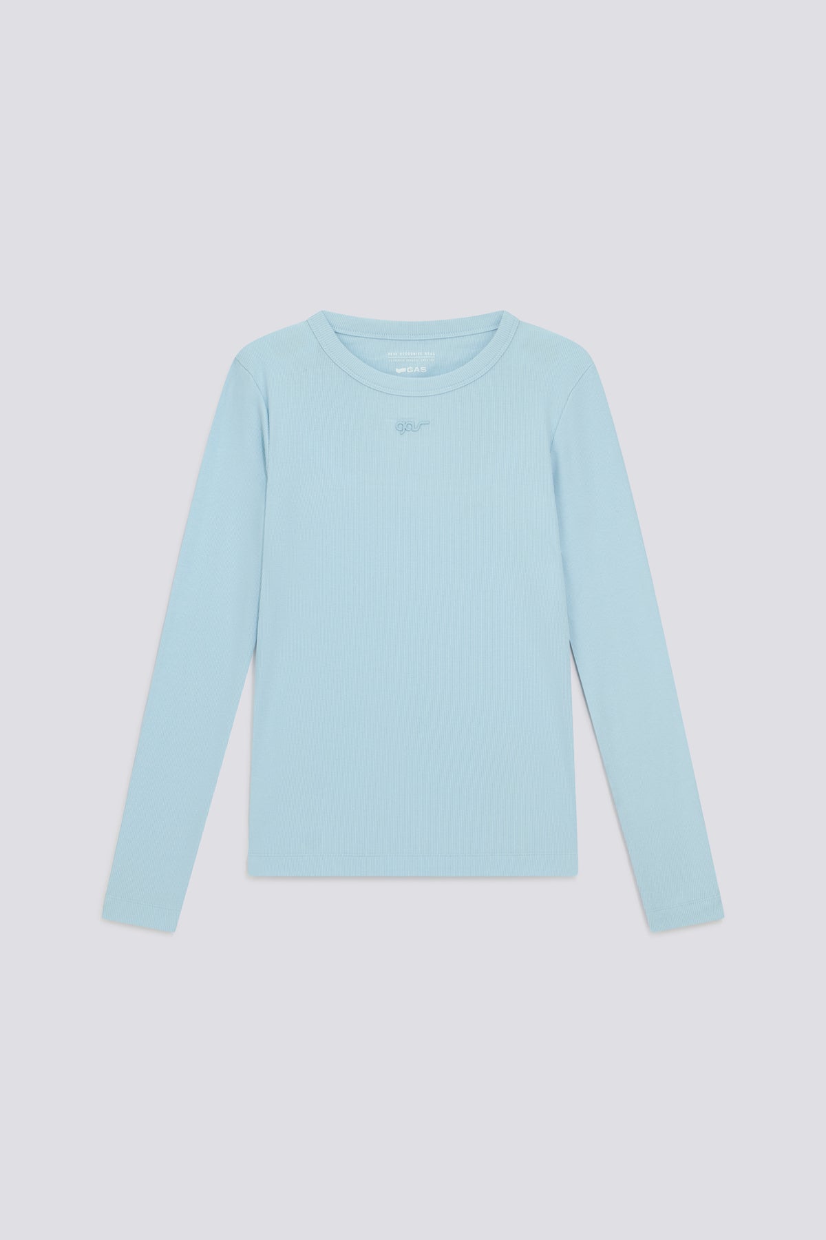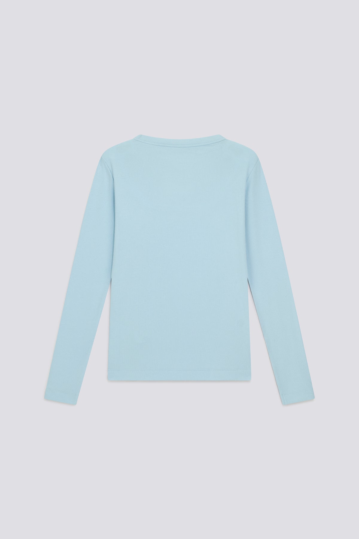 Hosszú ujjú, karcsúsított fazonú női póló világoskék színben.