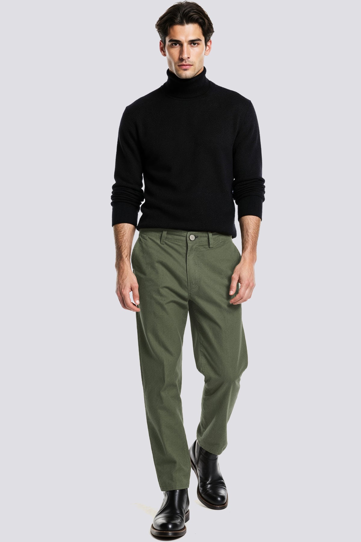 Férfi chino szabású nadrág, slim fit, stretch pamutgábardinnal, micro mintás allover. Egy klasszikus modern köntösben: a diszkrét minta személyiséget ad, míg a szoros fit és a stretch anyag kényelmet és sokoldalúságot biztosít minden megjelenéshez.