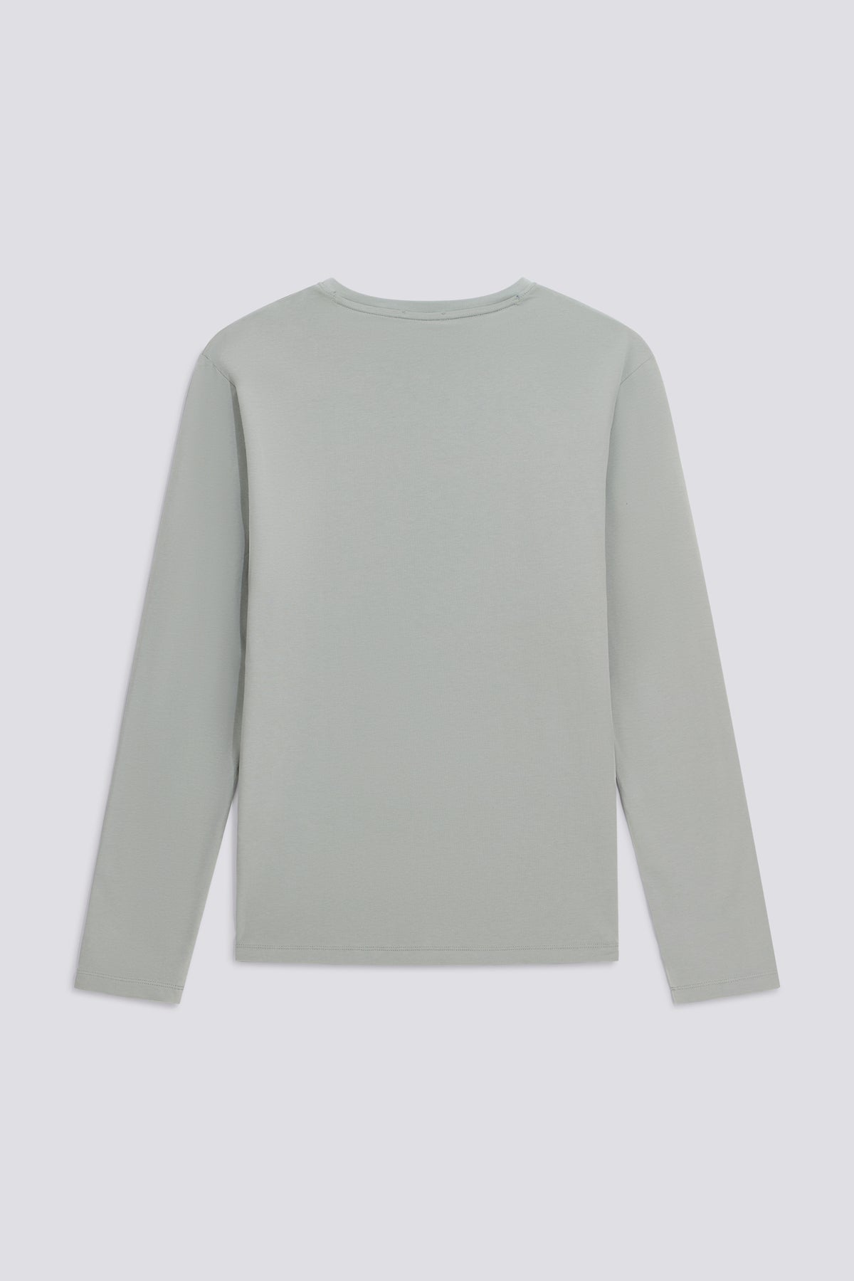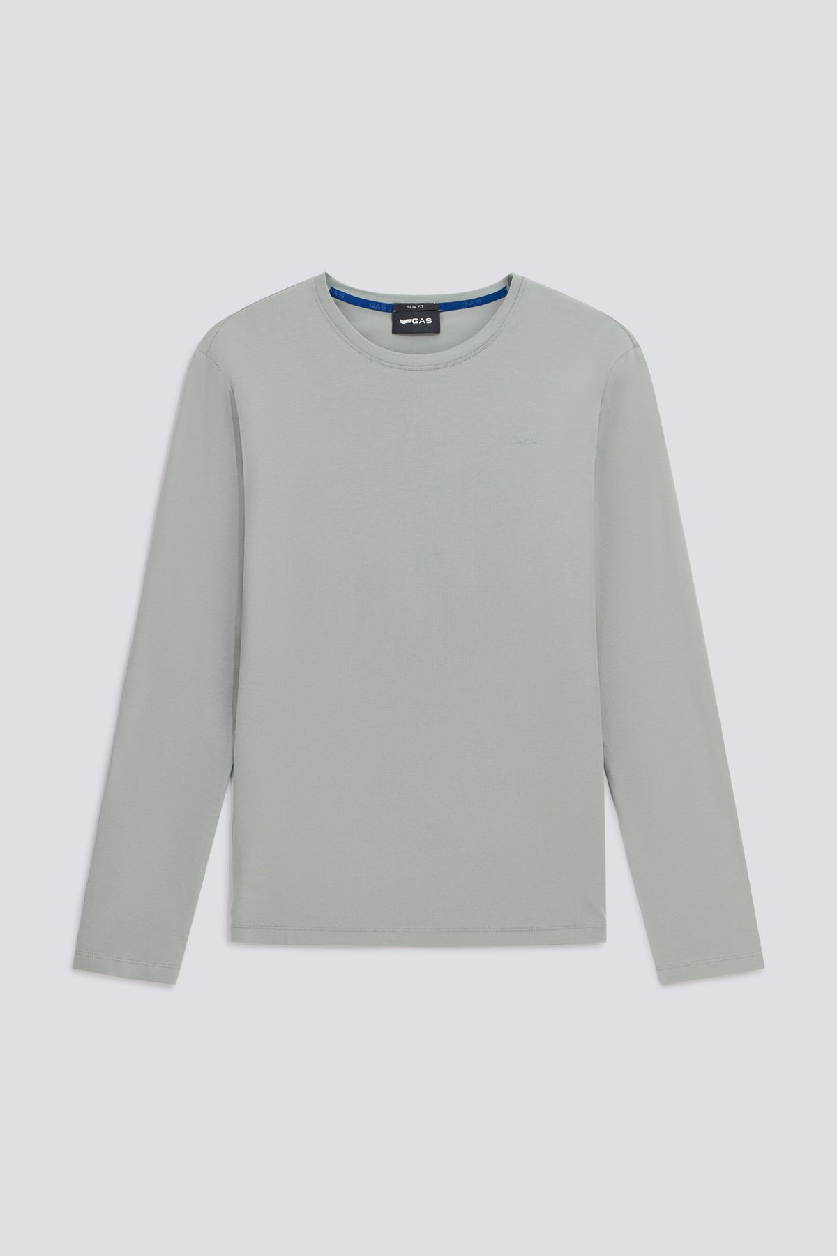 内側にロゴ入りの汗離れバンドが付いた、ストレッチジャージー素材のスリムフィット長袖Tシャツ。左胸には光沢のある同色ロゴプリントが施され、独特で現代的な印象を与えます。