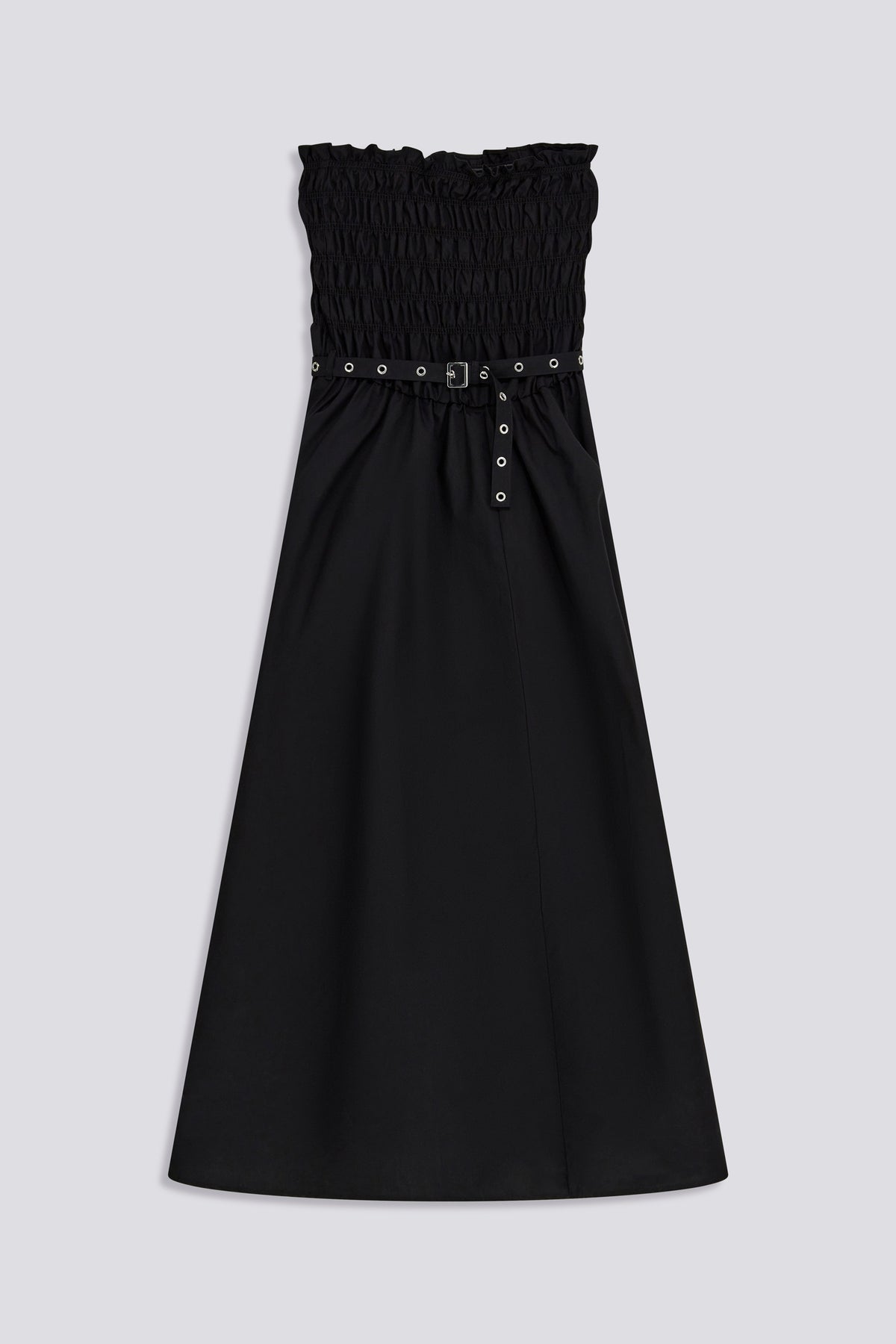 Abito lungo dalla linea fluida con corpetto smock che avvolge il busto e crea una texture elastica e strutturata. La cintura in vita, nello stesso tessuto, definisce la silhouette aggiungendo un dettaglio grafico discreto. La gonna si apre con volume morbido, accompagnando il movimento. Un capo essenziale ma deciso, pensato per un’eleganza quotidiana senza sforzo.