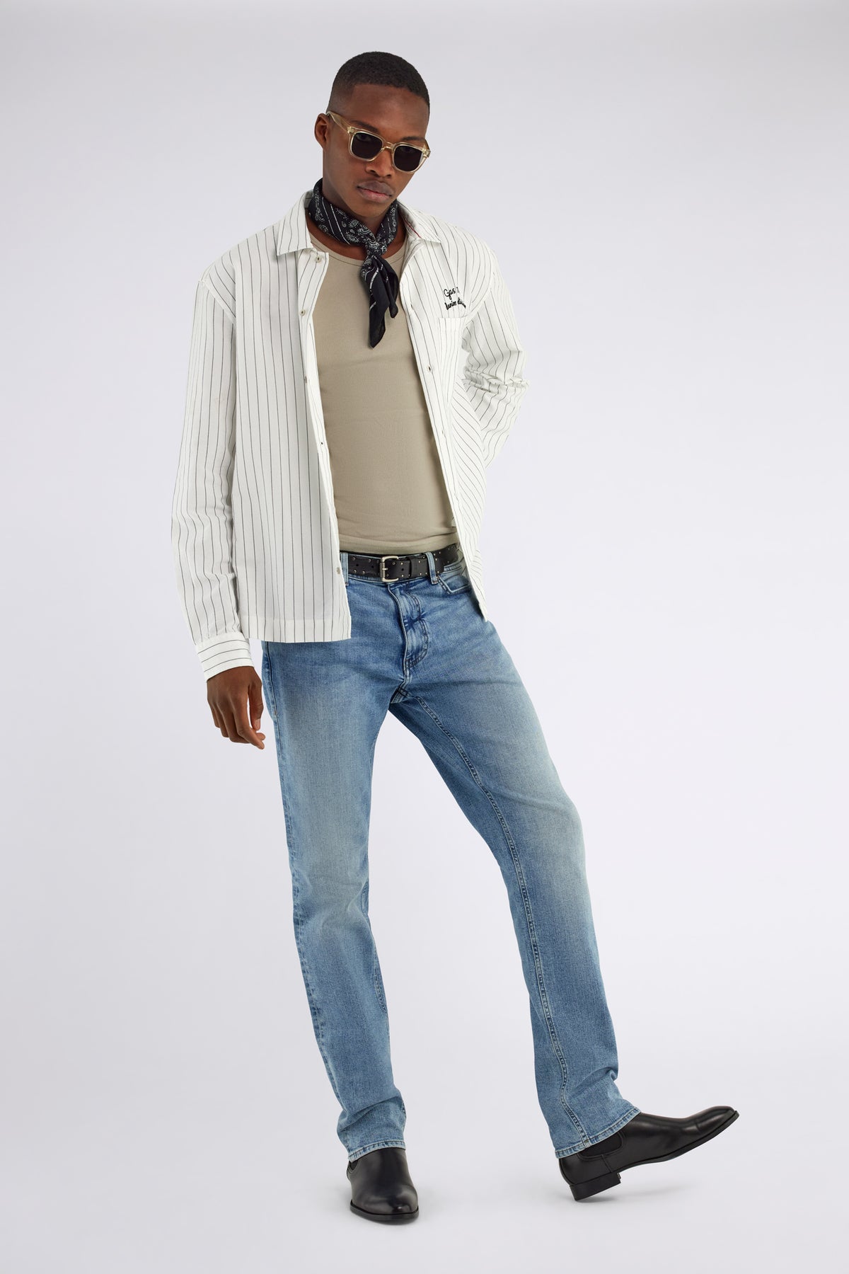 Jeans uomo cinque tasche straight fit in denim blue indigo stretch 12.25 oz. Il lavaggio basic medium light dona al capo un aspetto clean, con leggere variazioni cromatiche che alleggeriscono l’indigo. Il fit straight mantiene una linea dritta, facile da indossare ogni giorno e da abbinare a camicie, T-shirt o maglieria leggera. Un denim versatile, pensato per un guardaroba essenziale ma curato, adatto a diverse occasioni d’uso.