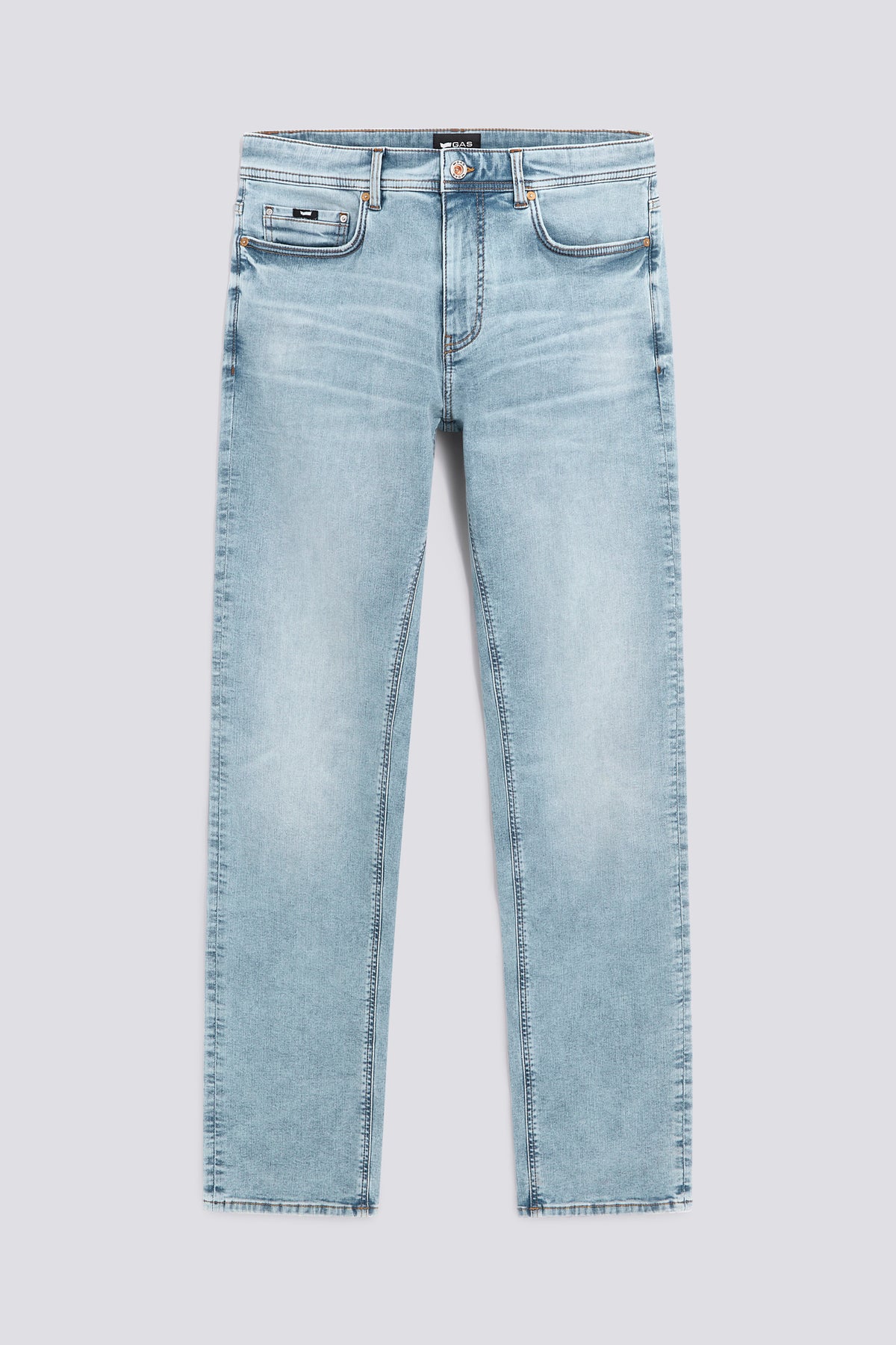 Jeans uomo cinque tasche straight fit in denim stretch 10.50 oz. Il lavaggio stone medium light è definito da leggere abrasioni su tasche e fondo mentre il denim stretch accompagna la gamba mantenendo una linea dritta, ideale per look quotidiani che spaziano dal casual più essenziale ad abbinamenti più curati con camicie o giacche leggere.