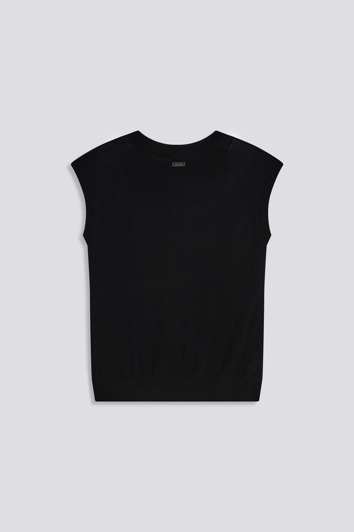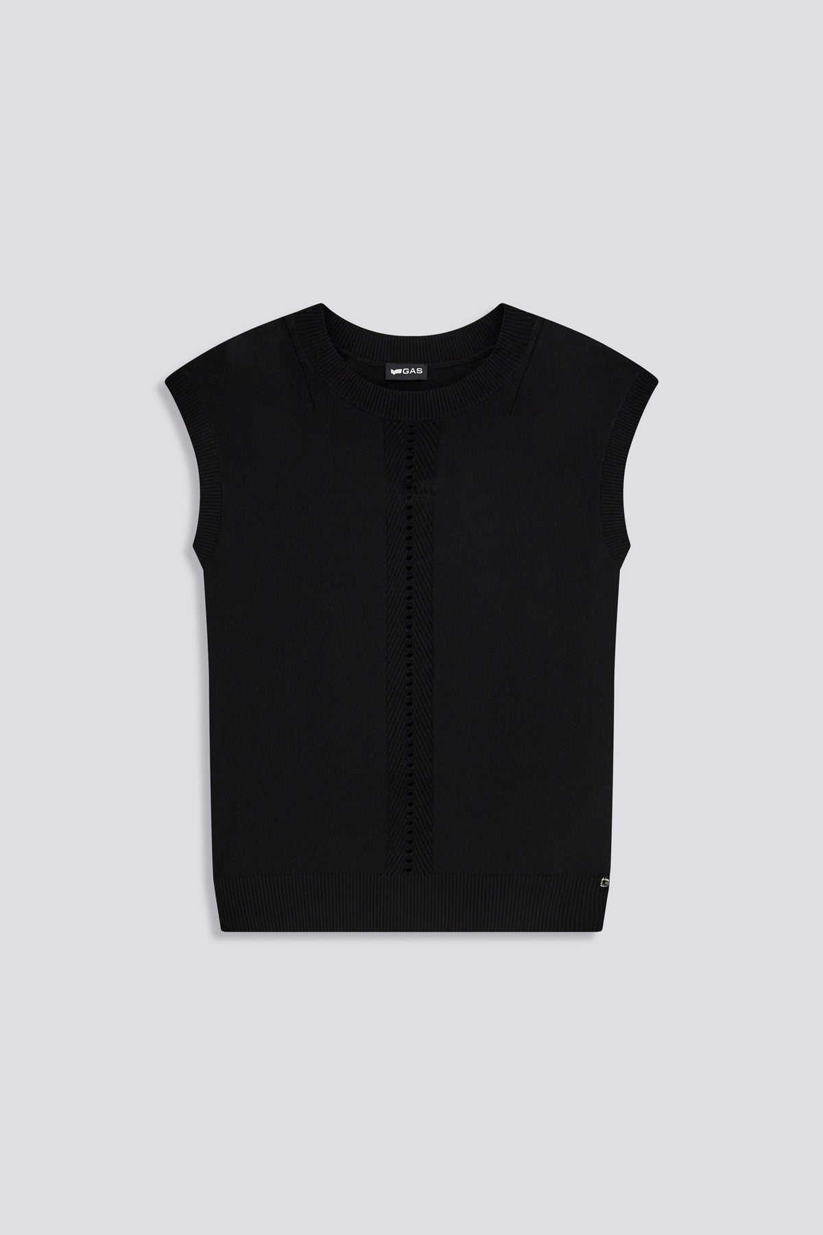 Top smanicato in maglia dalla linea slim, realizzato in filato leggero di viscosa. Il design essenziale è arricchito da un motivo traforato centrale che dona attitude al capo. Dettagli metallici completano il capo: il pendente “G” sul fondo e la placchetta logo sul retro. Perfetto da indossare da solo o sotto giacche leggere per un look sofisticato.